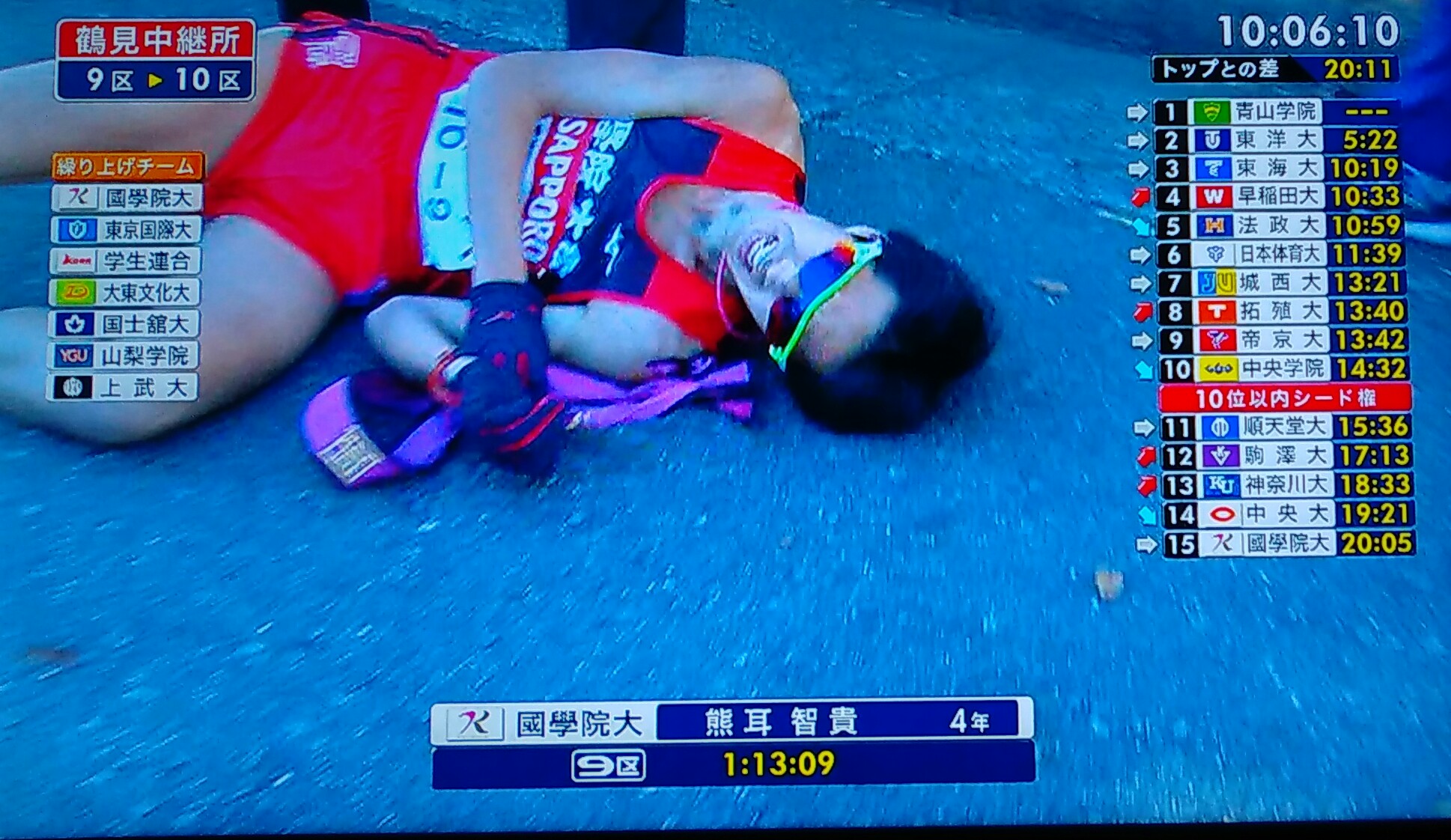 しかし、國學院大学の走者の消耗は激しく、ふらつきながらも必死でたすきを手に最後の力をふりしぼり…。