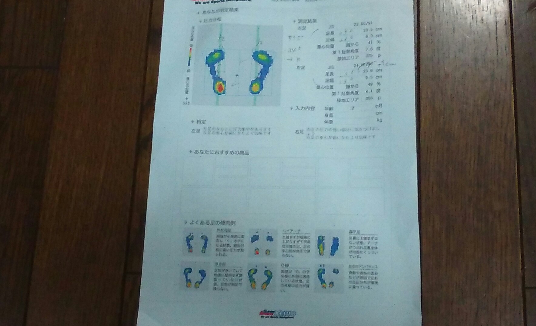 足のサイズ、形、重心バランスが記録紙に打ち出され、そこから足に合ったランニングシューズを選んでもらいました。
