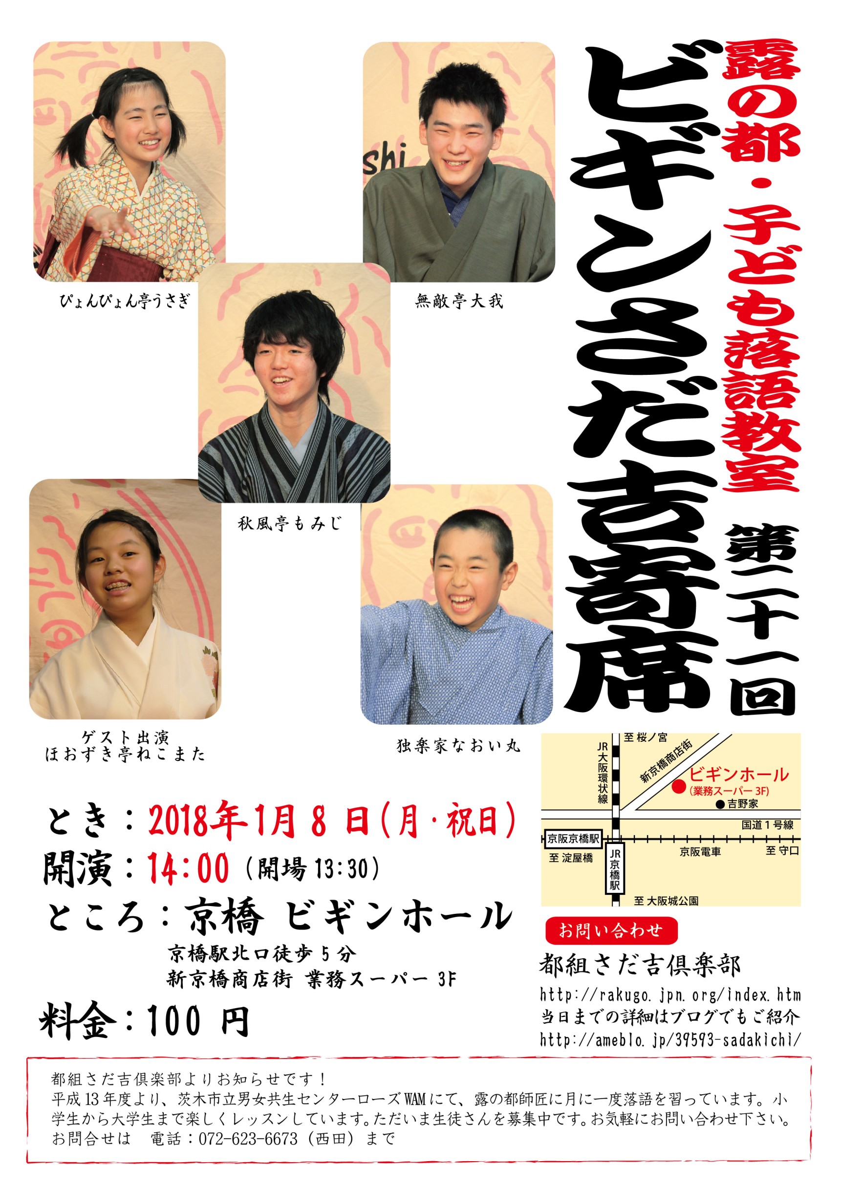 ビギンさだ吉寄席は、露の都さん(日本で第一号の女流落語家)が茨木市で開いておられる子ども落語教室『都組さだ吉倶楽部』の生徒さんによる落語会で、春夏冬休みに合わせ、年に3回開催されてます。