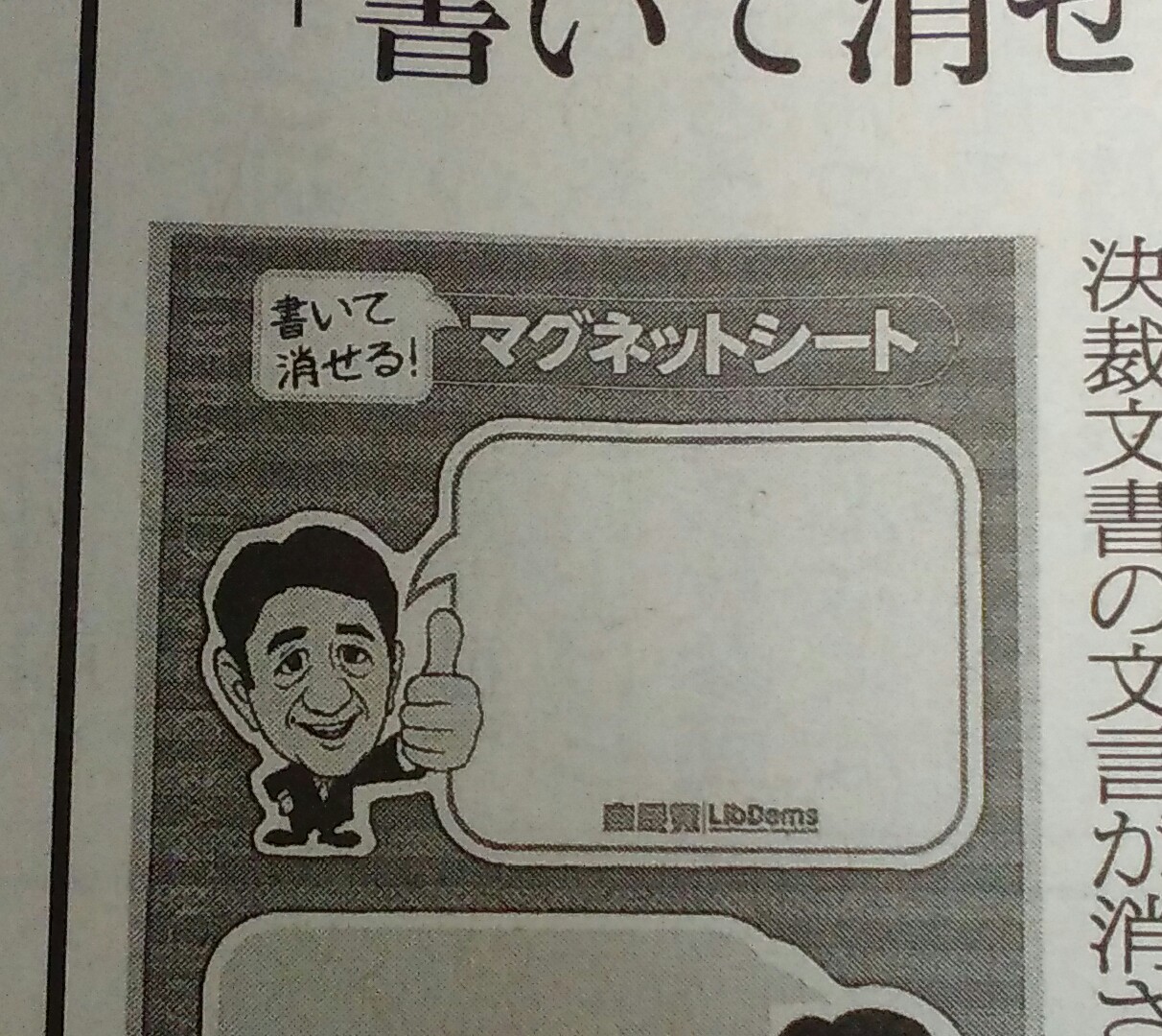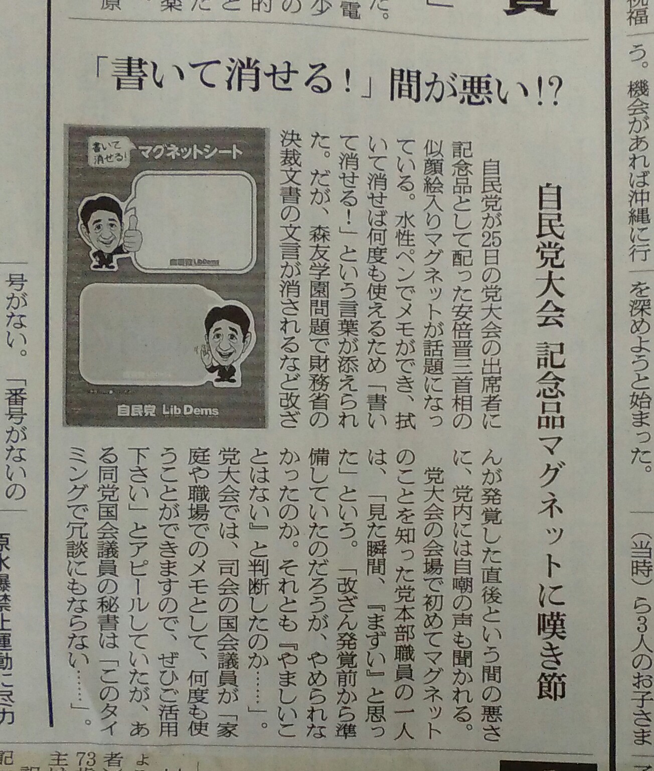 自民党が、25日の党大会の出席者への記念品として安倍首相の似顔絵入りマグネットを配布したそうですが、水性ペンで書き、拭けば消して何度でも使えるため、