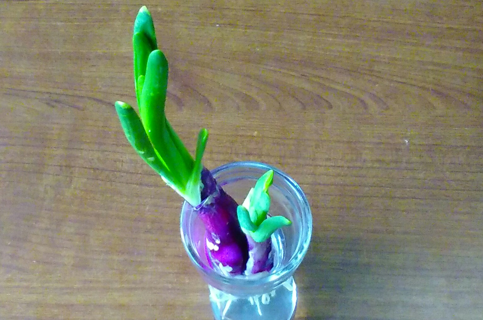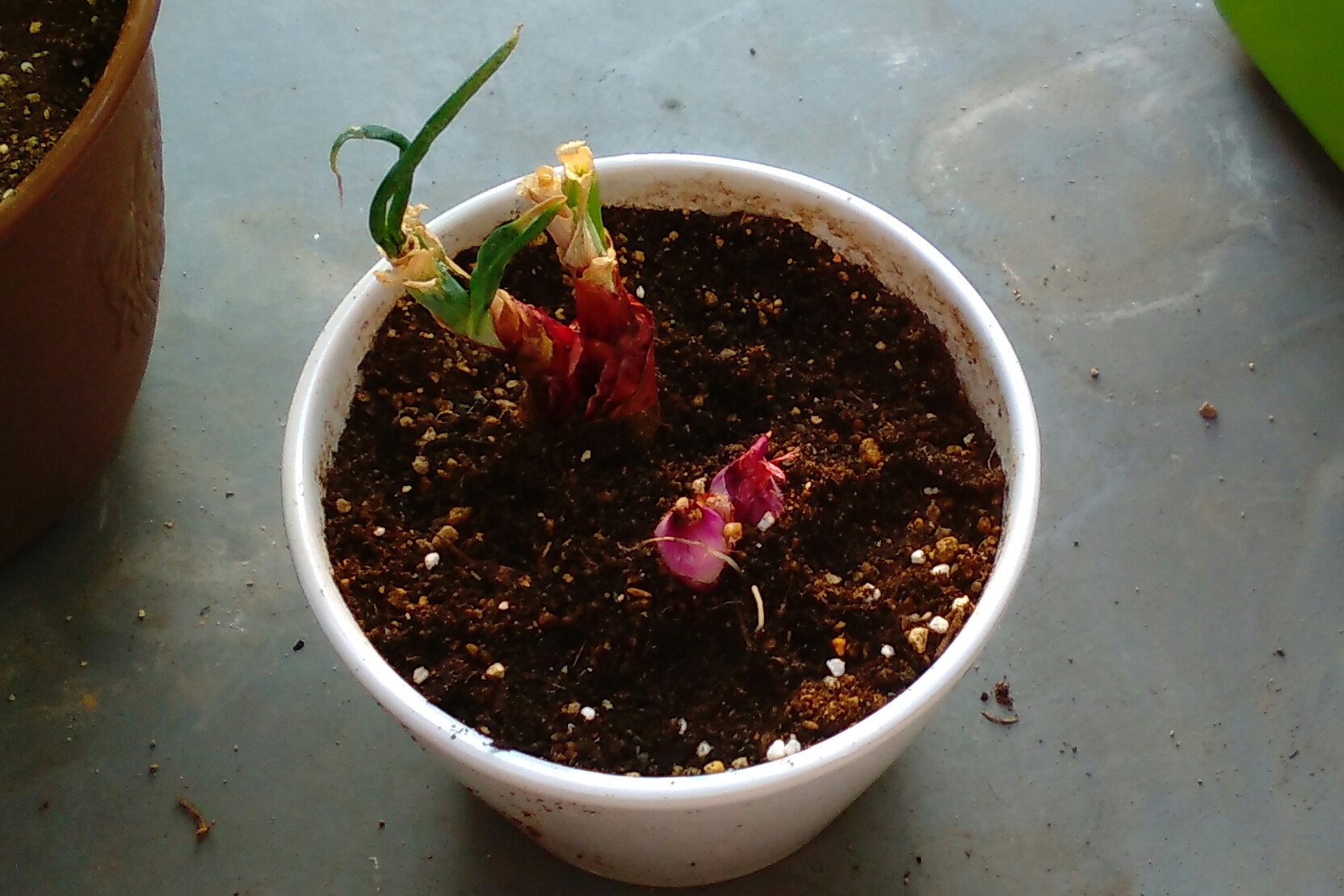 次に植えたのは、うっかりしてて、芽が出た紫玉ねぎ。