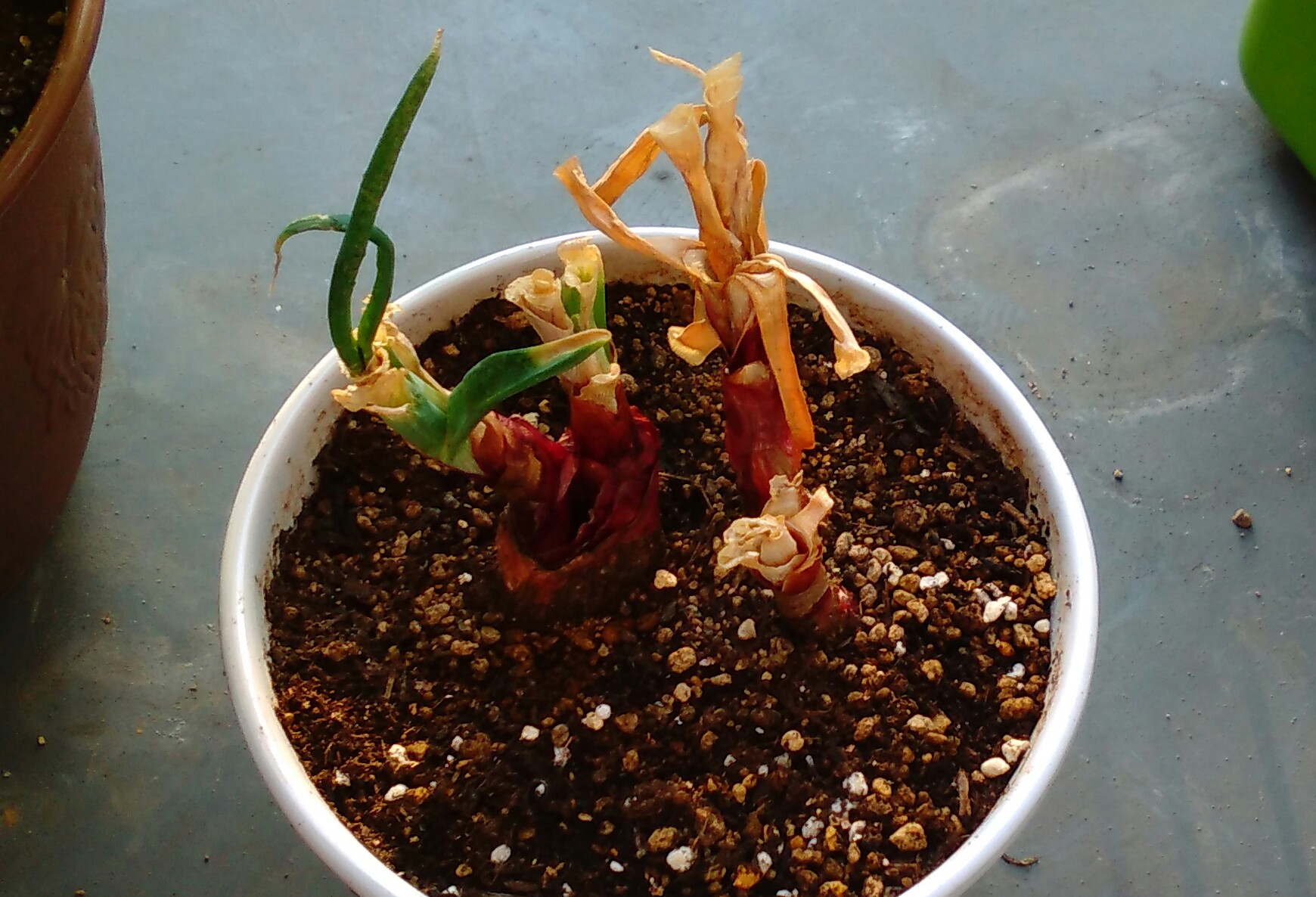 外側の実ははがして食べ、芯に近い芽の出た部分を、最初は観賞用に水耕栽培にしかけたのですが、土残ってるやん、と気づき鉢植えに。