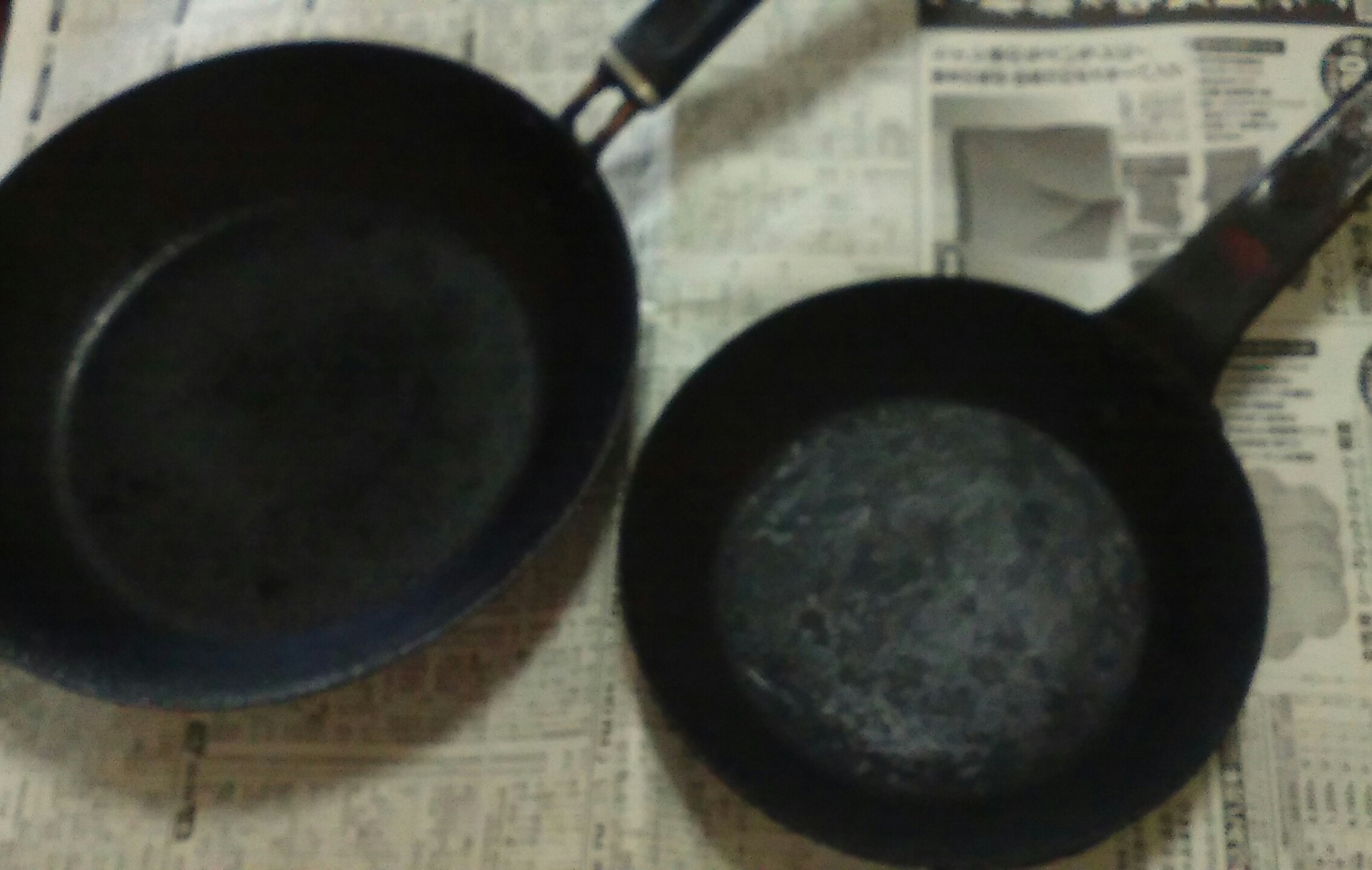 テフロン加工のフライパンはオムレツとオムライス専用にしているのでめったに使わず、毎日のように酷使しているのが大小2個の鉄フライパン。