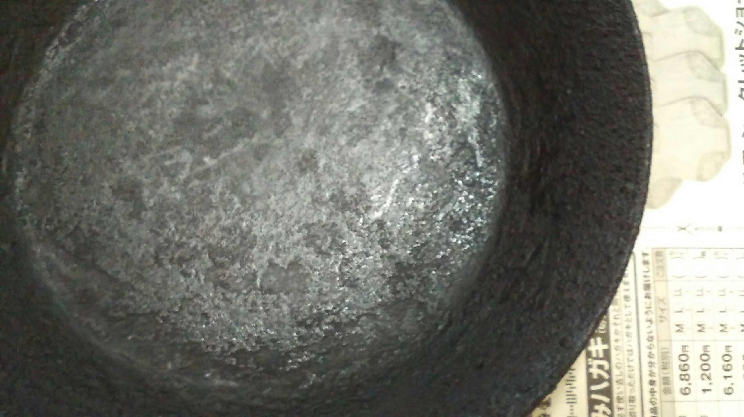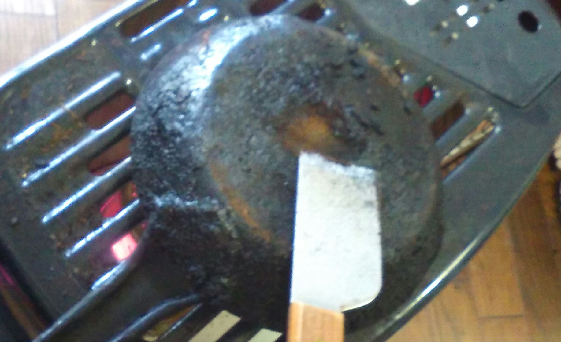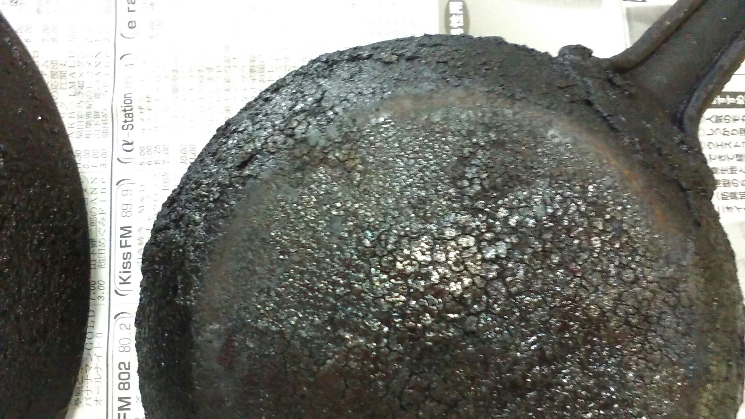 裏表で合計2時間半ほど熱し、コゲが浮き上がってかたような感じになったので、ヘラでコシコシ。