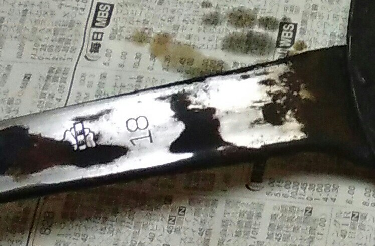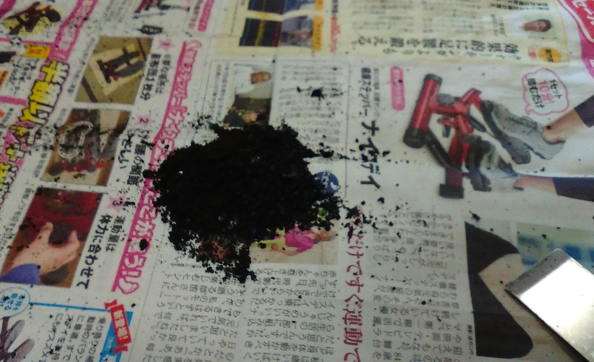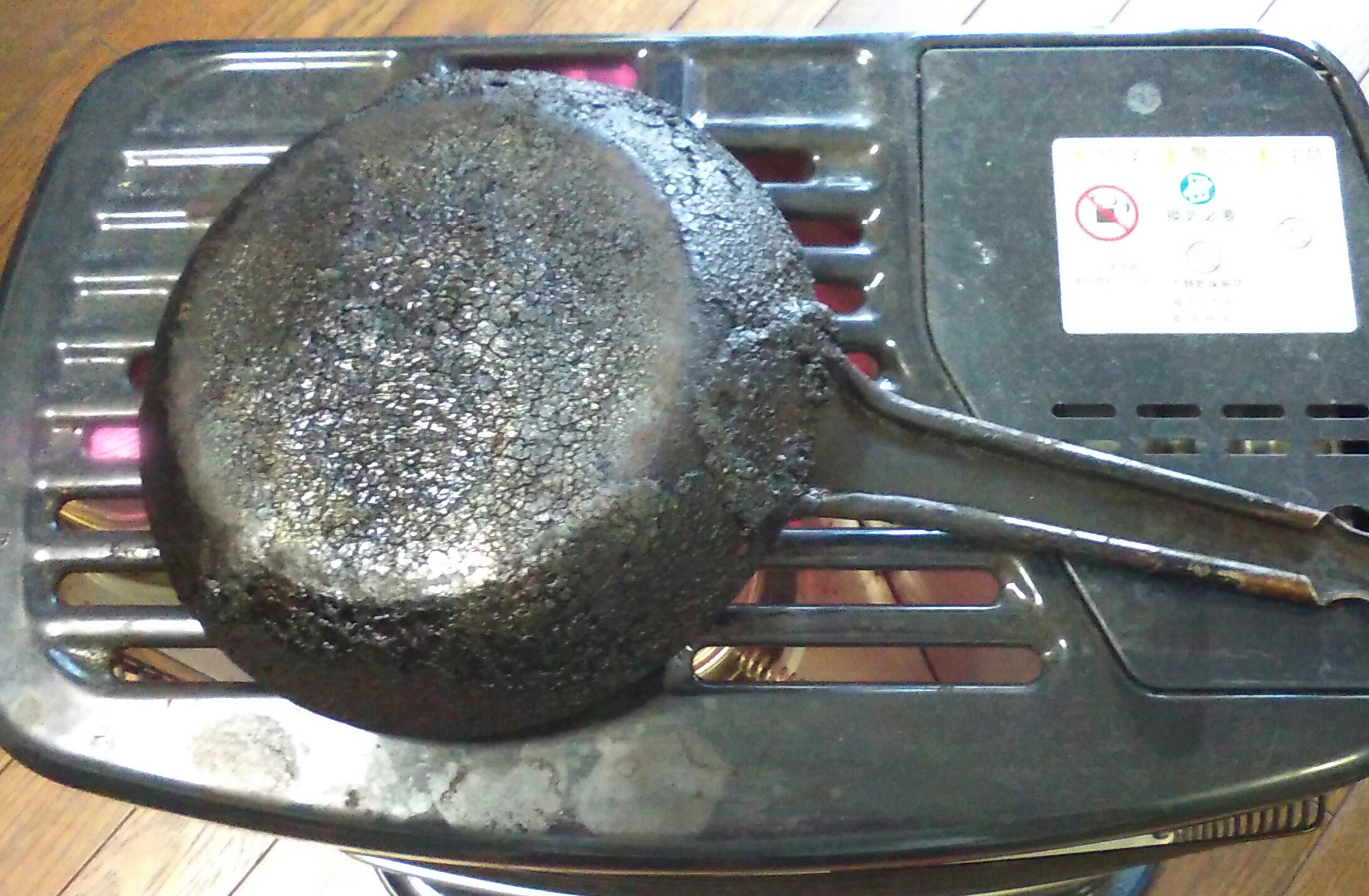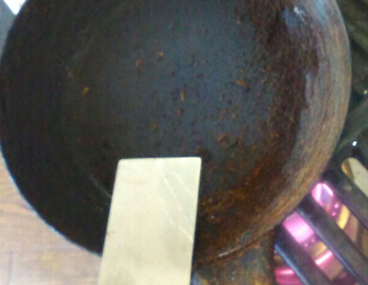 裏表で合計2時間半ほど熱し、コゲが浮き上がってかたような感じになったので、ヘラでコシコシ。
