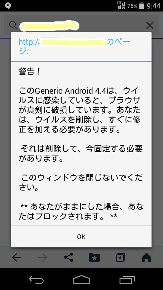 緊急報告!要注意・偽の『ウイルスに感染しています』警告が出た