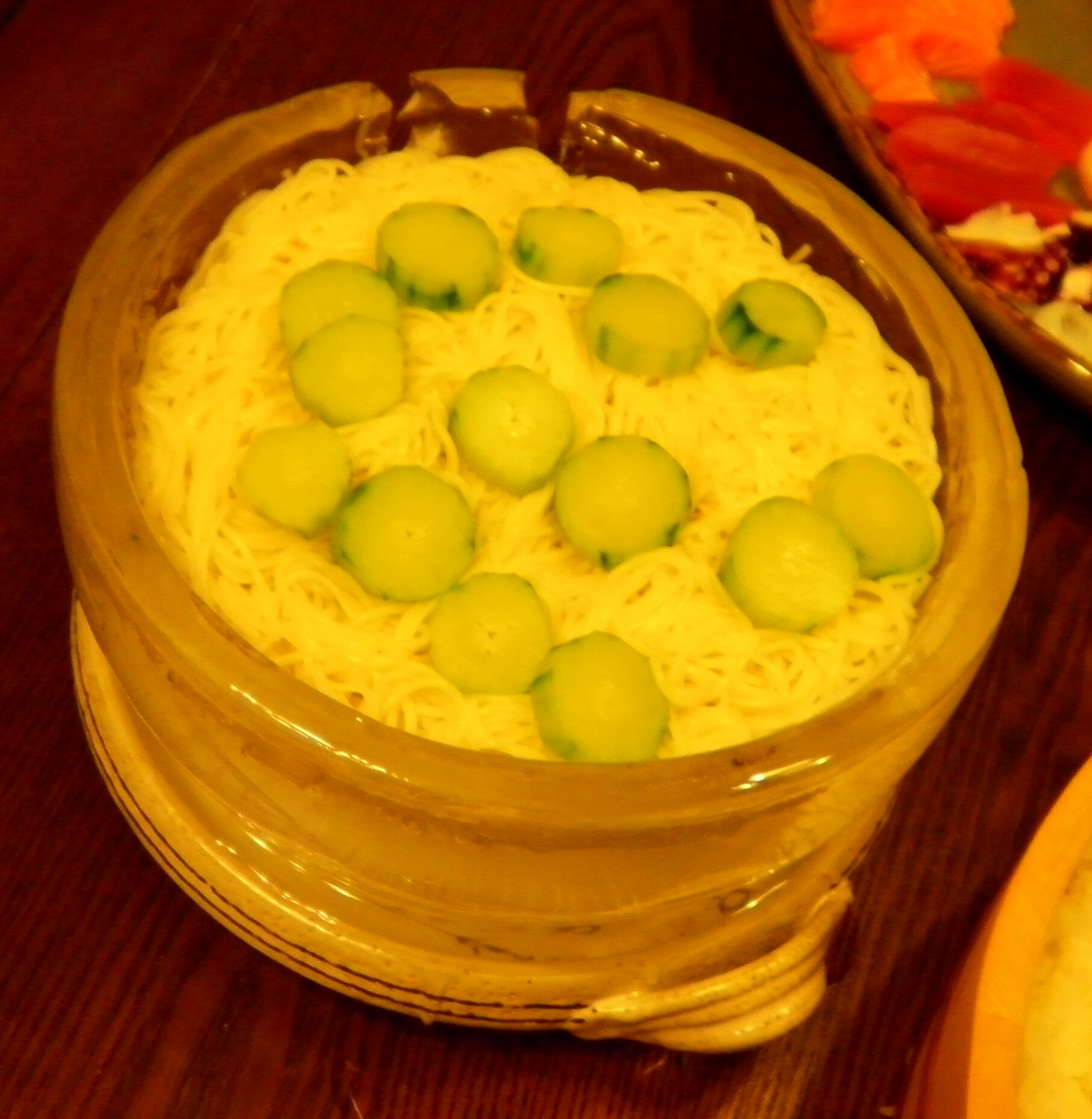 茹でた素麺を入れて水を張って、キュウリの輪切りなんぞ浮かべてみて。