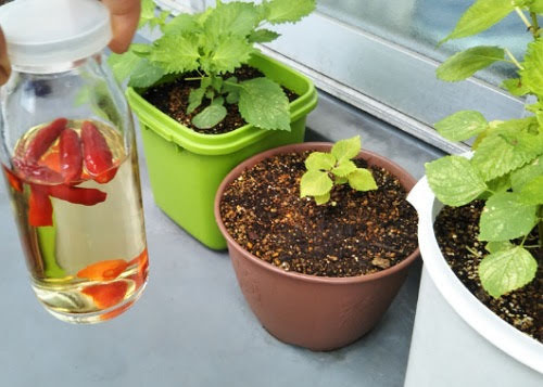 シュッとすると舞い散る唐辛子エキスでゲホゲホしながら、葉の裏に霧吹きでかけています。