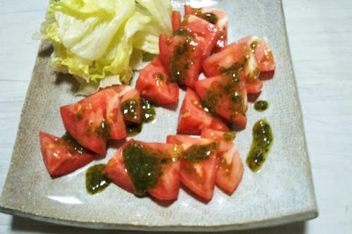 これは青ジソドレッシングで食べるトマトサラダ。