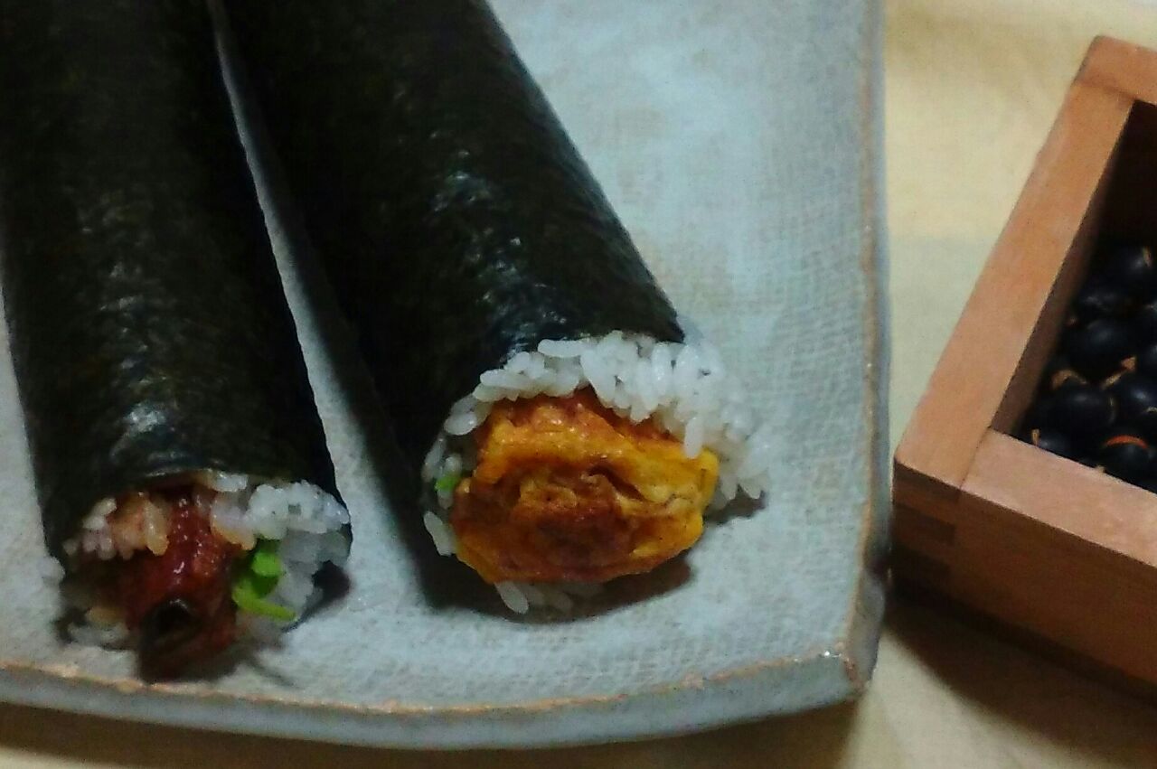我が家の今年の恵方巻きは、甘くておっきな玉子をどーんと巻いただけの『玉子巻き』と、鰻を巻いただけの『鰻巻き』2種。