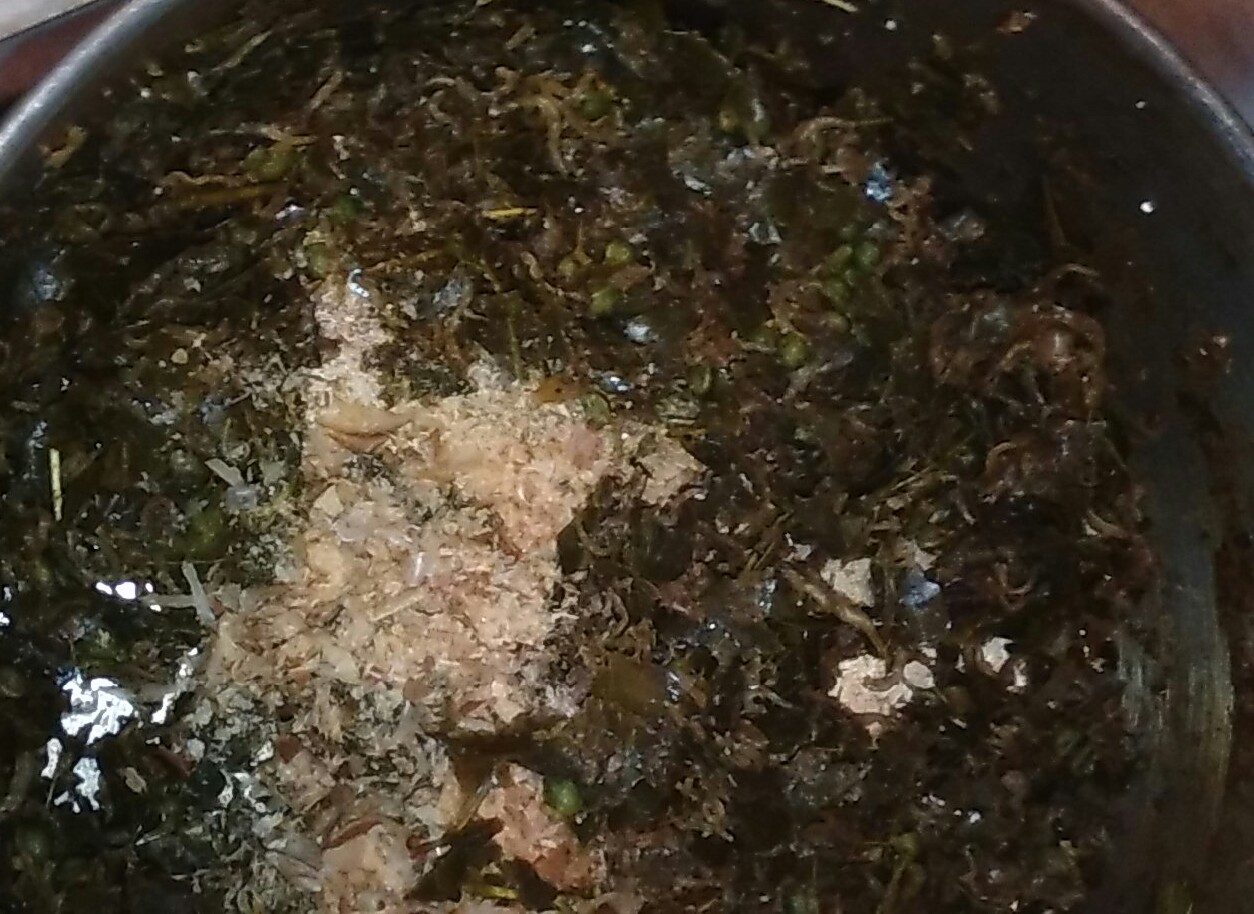 ②こげつく寸前で最後に鰹節を入れ、混ぜれば完成です。
