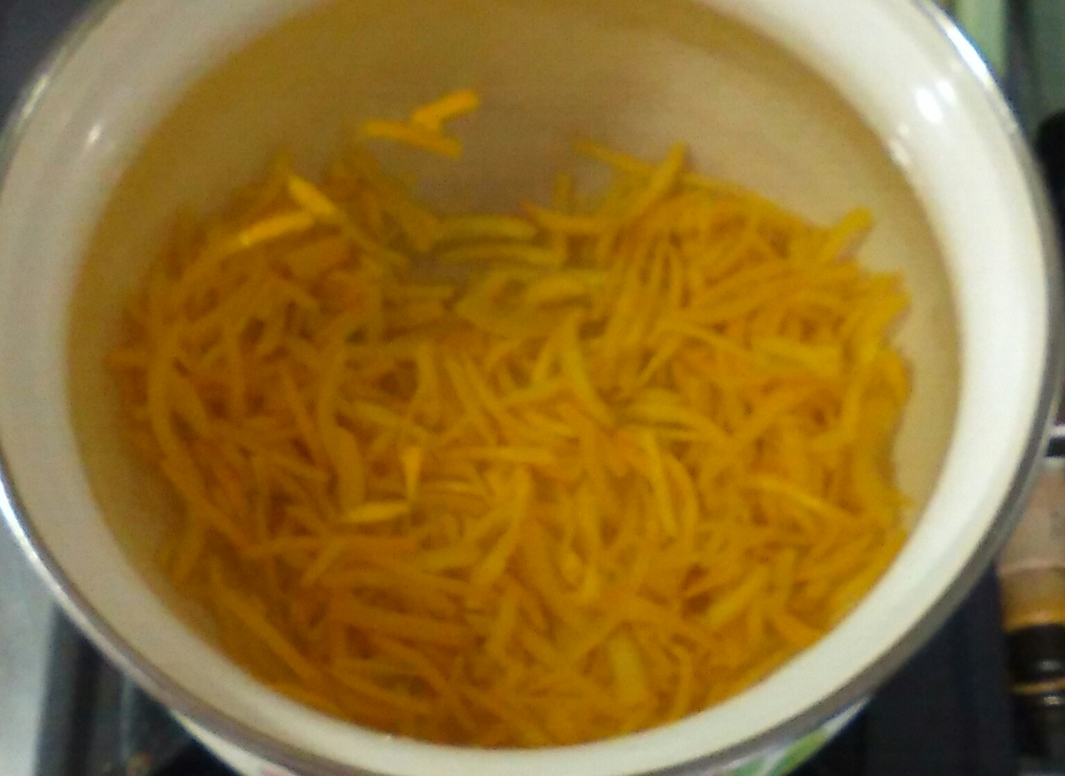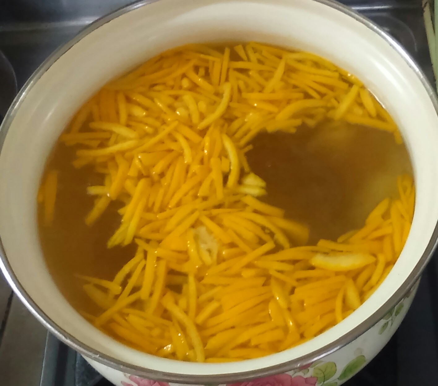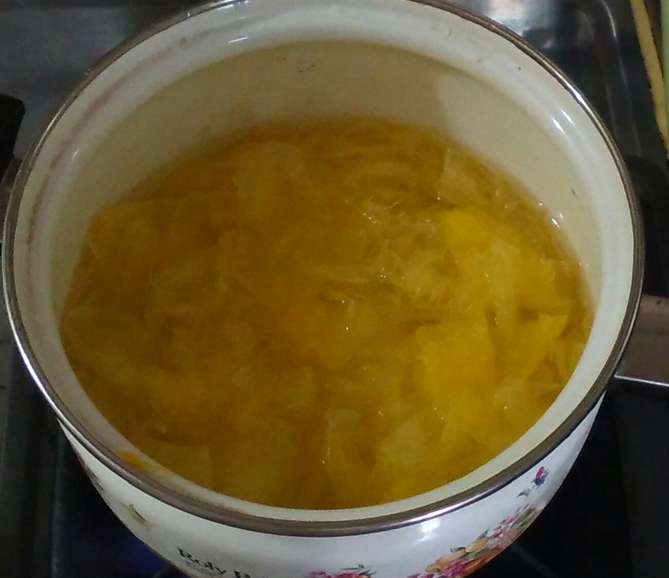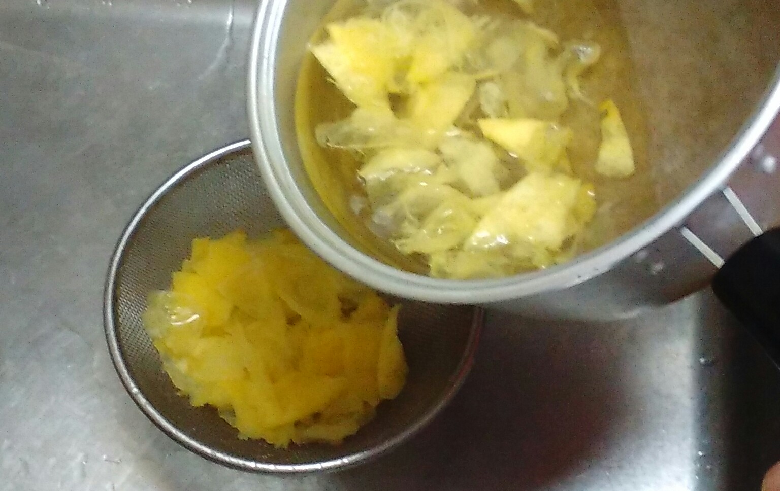 ③Step.1でとっておいた皮の白い部分を合わせ、20倍の水でゆで、煮たてば水を捨てる。