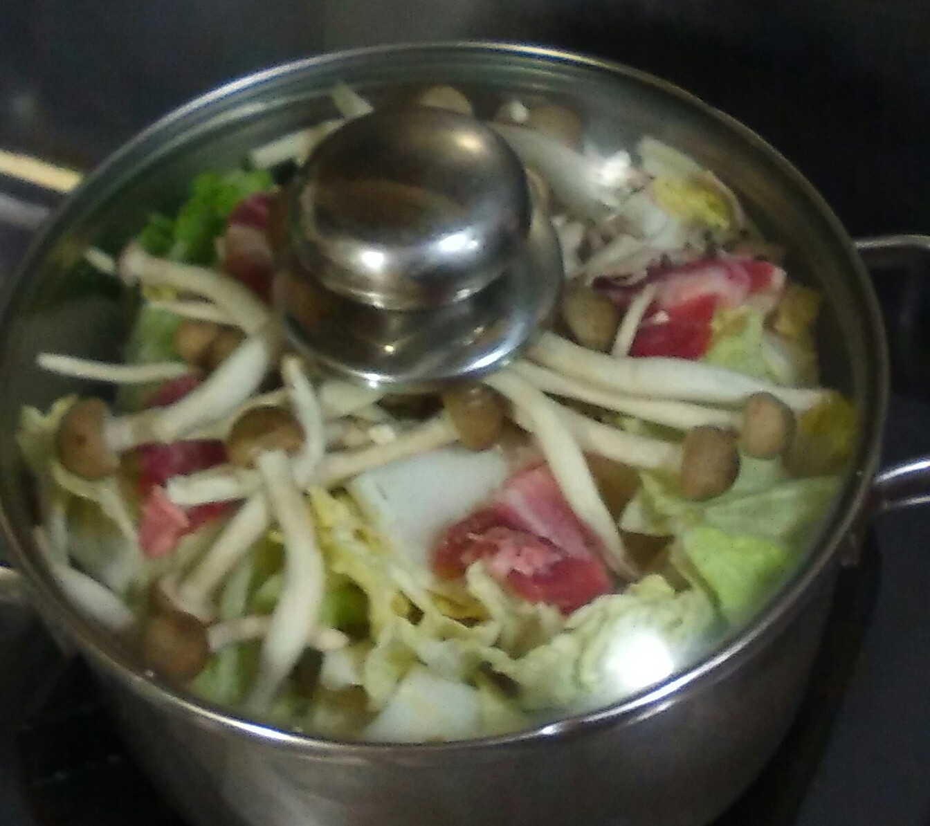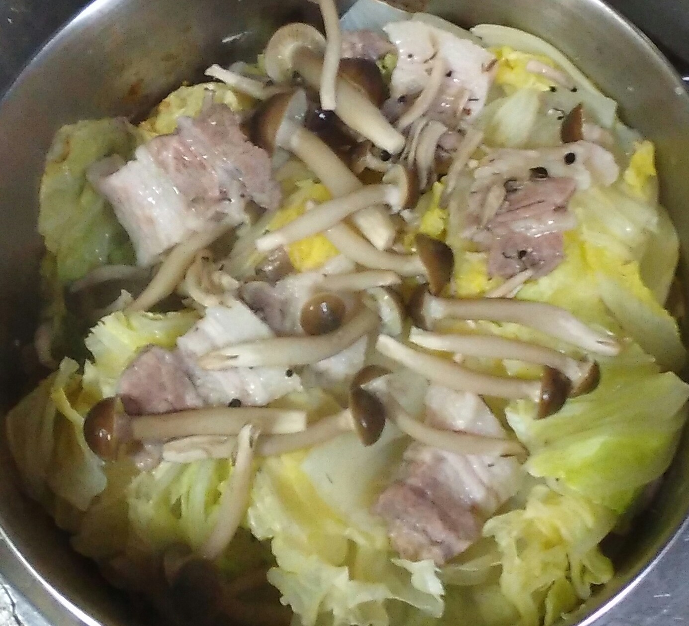 豚バラ、白菜、粗塩、(しめじ)を繰り返して重ねてゆく。