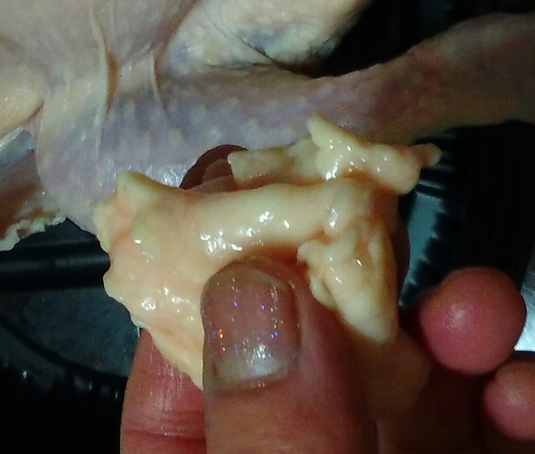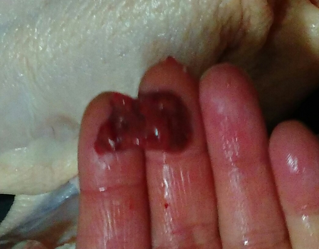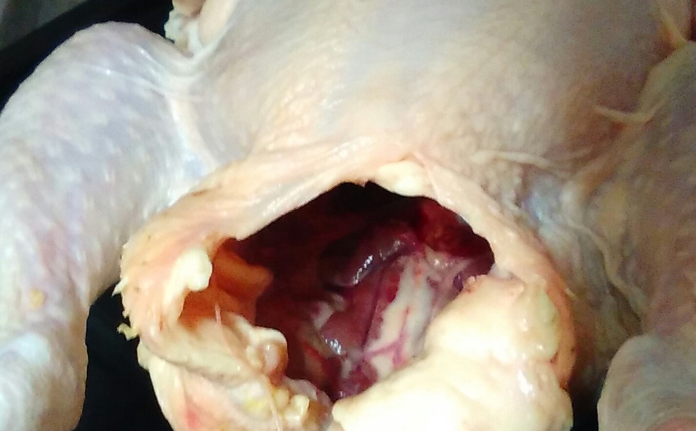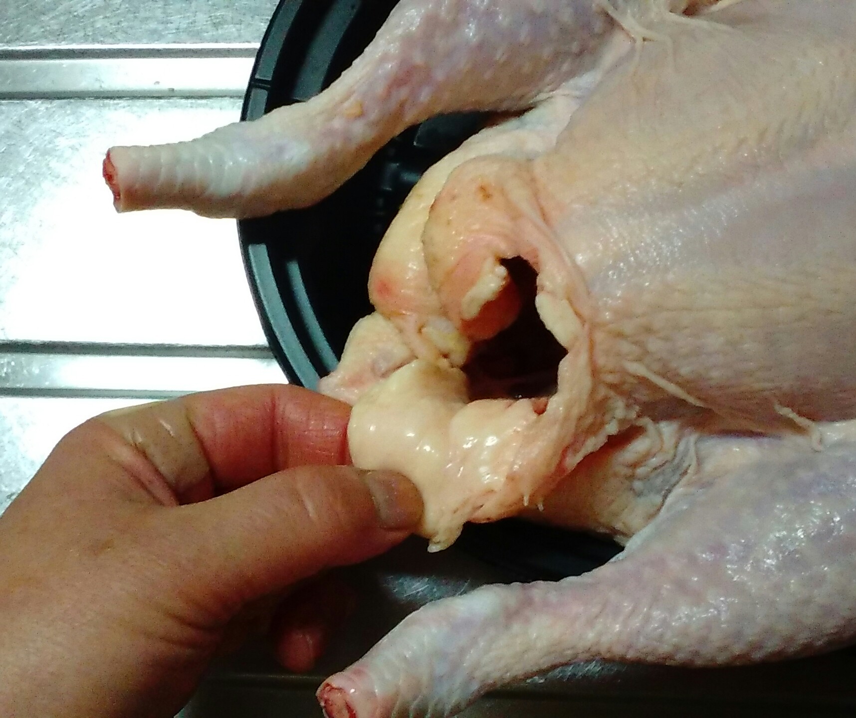 買ってきた丸鶏は、内臓は抜いてくれていますが、取りきれていない背肝が胸骨の回りに残っているので、手を突っ込んで取り除きます。