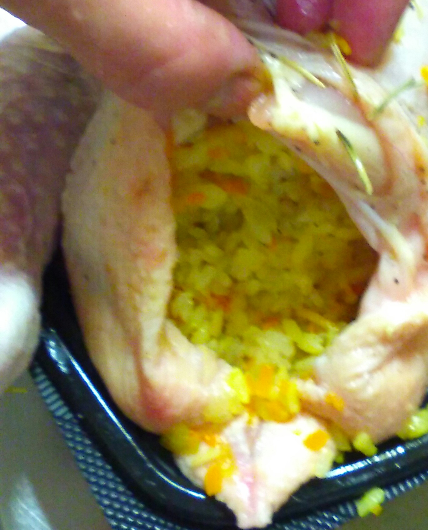 ②サフランライスを詰める。1.5キロ位の鶏にちょうど1合のサフランライスが入ります。