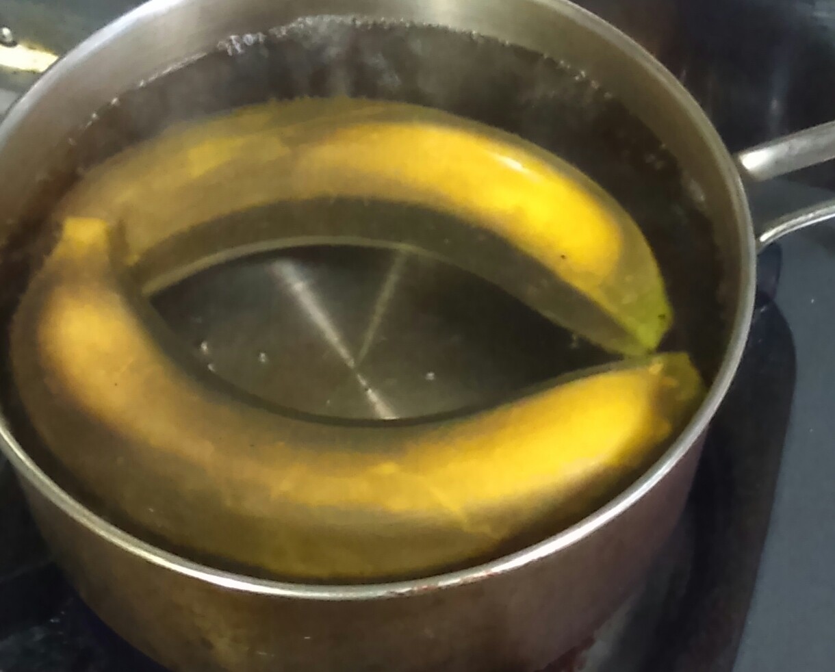 ①湯を沸かし、バナナを皮ごと5分間ゆでる。