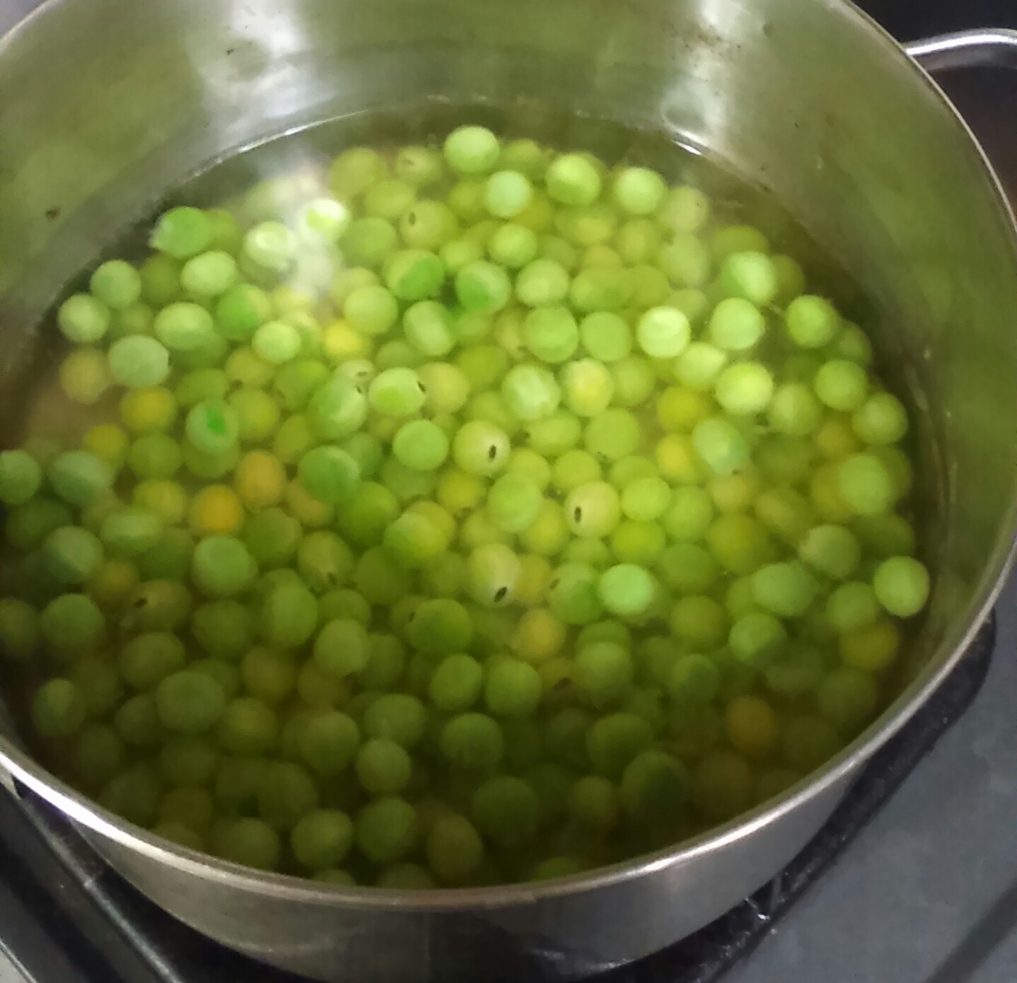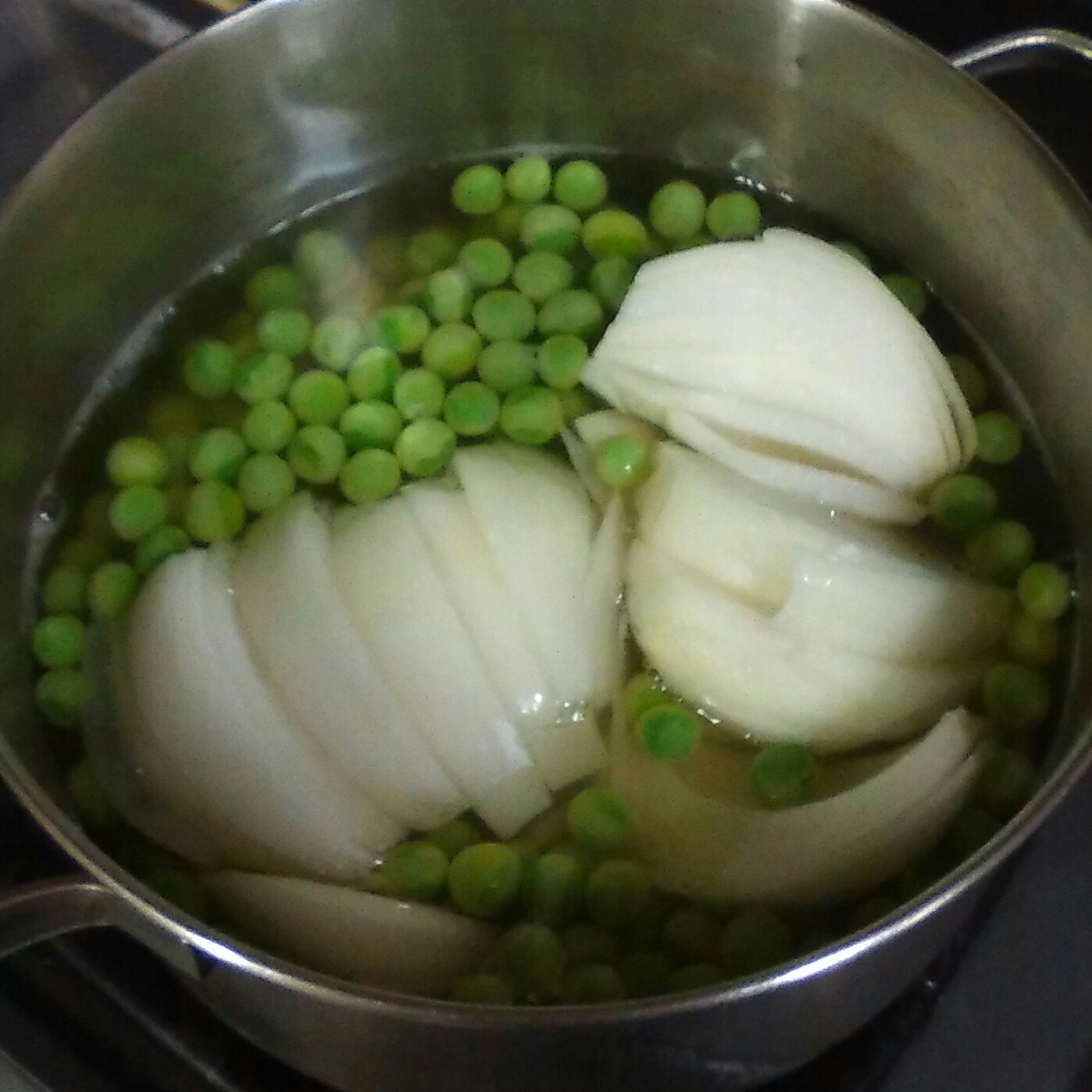 ①だし汁を煮立て、さやをむいて洗ったえんどう豆を入れる。
