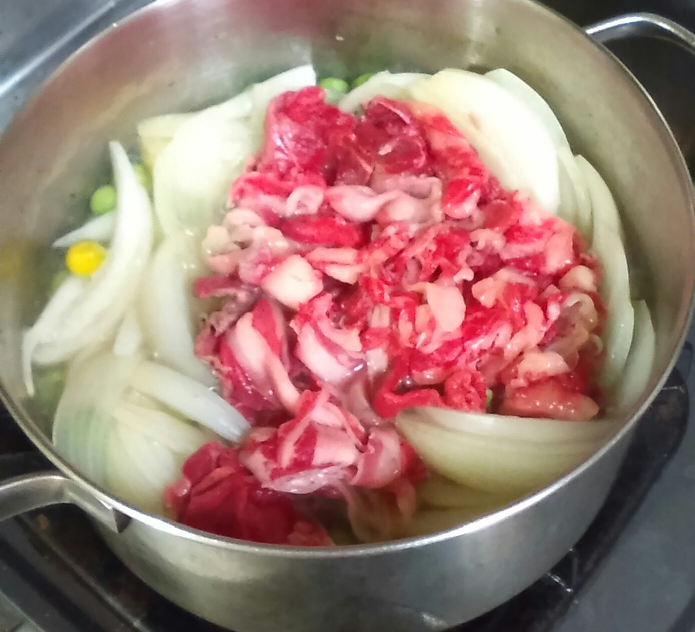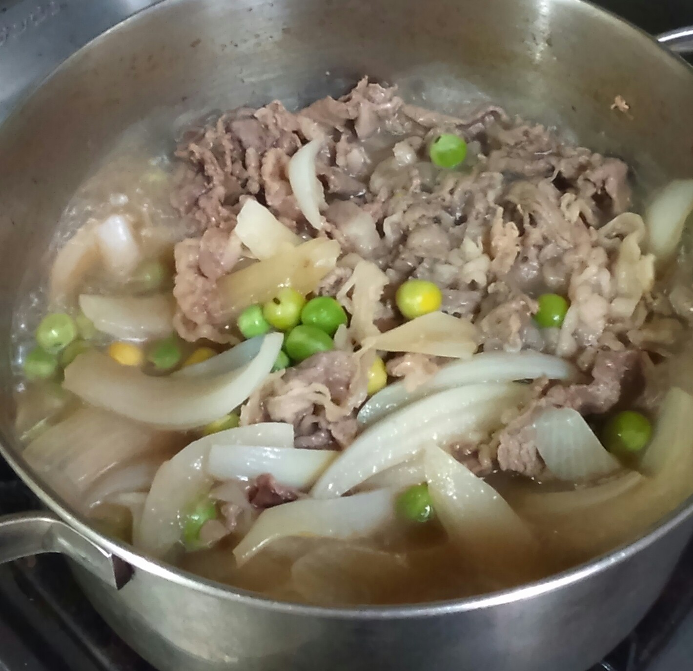 ③えんどう豆と新玉ねぎに8割方火が通れば、牛肉を入れ、アクを取り除き調味料を加える。