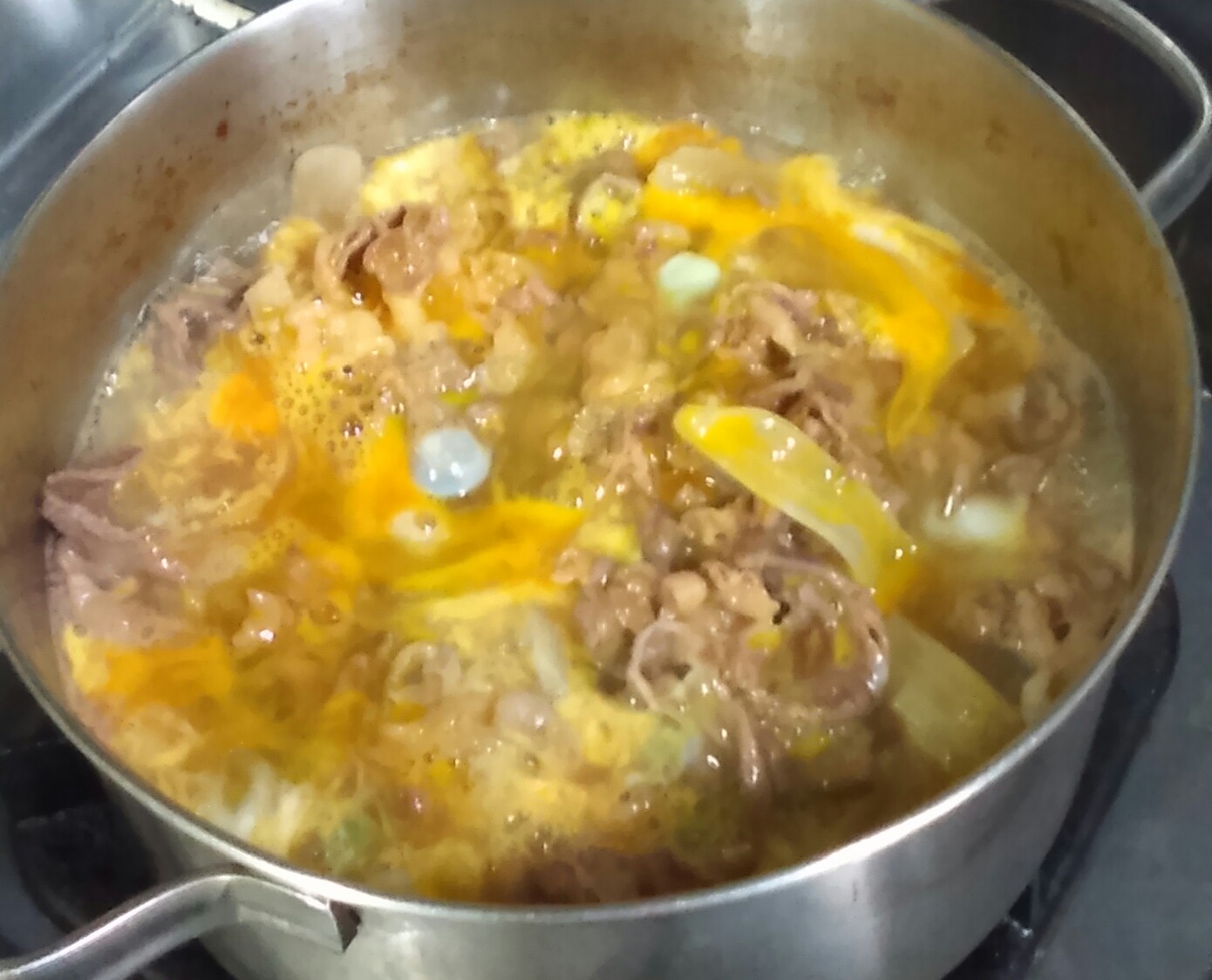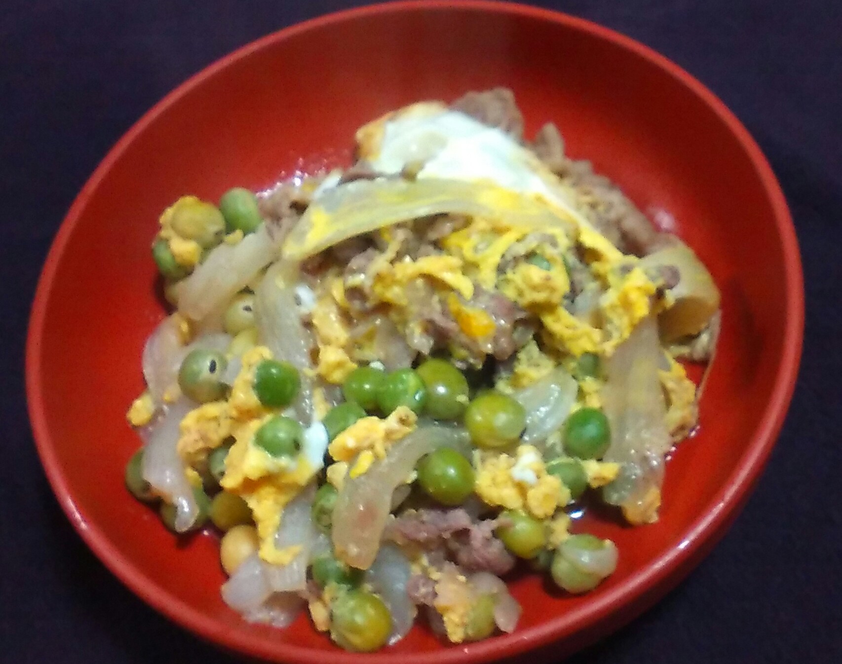 材料も、タケノコと糸こんにゃく→えんどう豆に替わっただけで、牛肉と新玉ねぎとダシや調味料は同じですし、卵でとじてもとじなくても良いところも同じ。