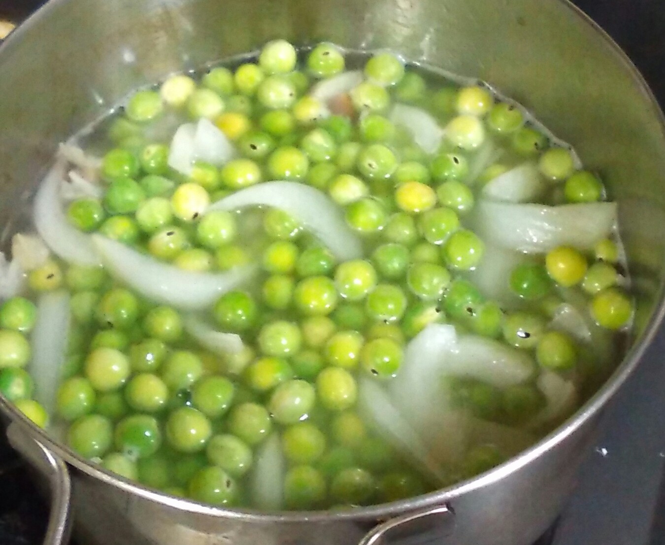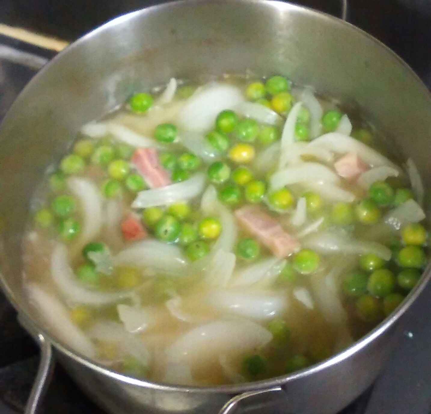 ③水400ccと固形スーブの素を入れ、煮立てば、さやからむいて洗ったえんどう豆を入れる。