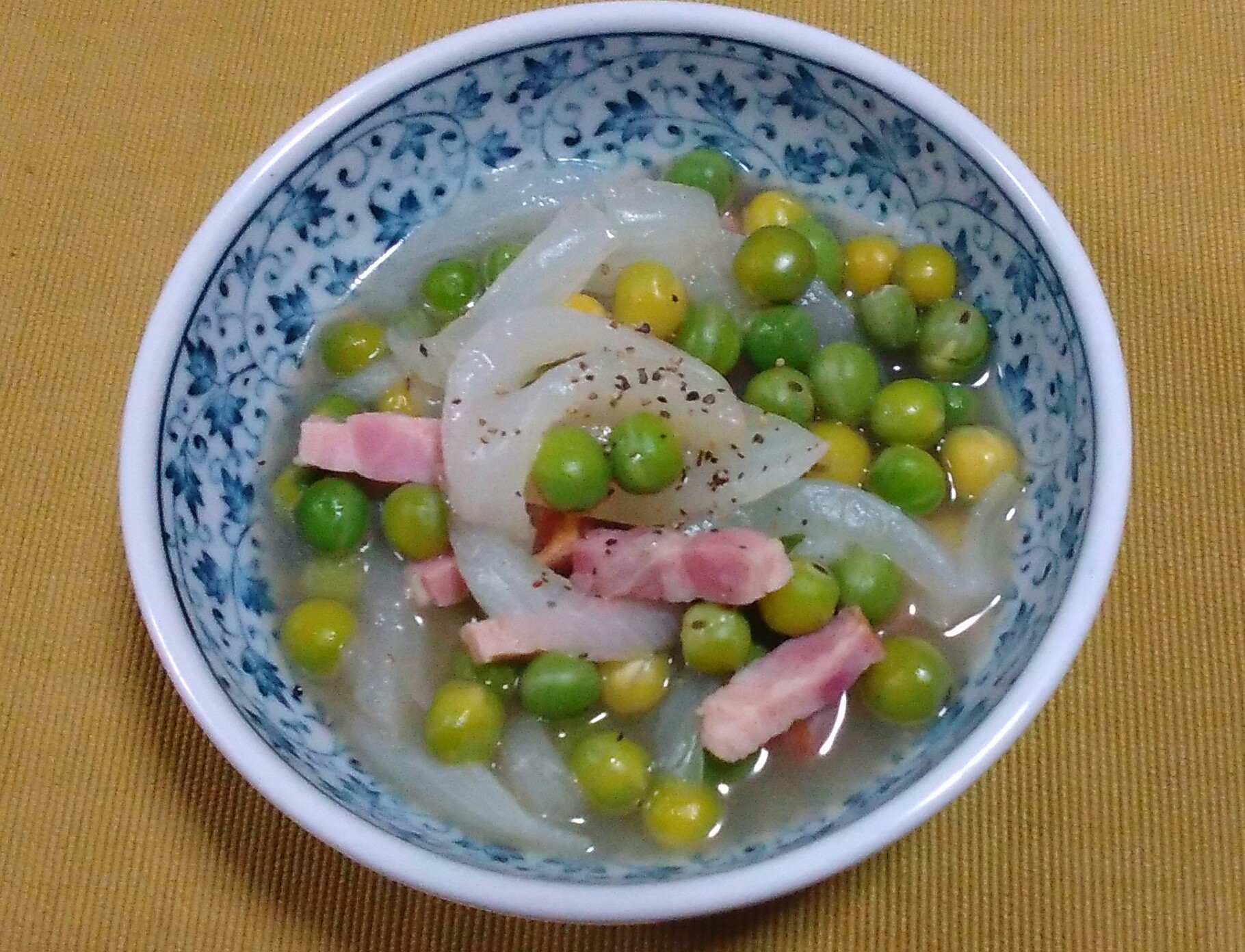 フランスでよく作られるお惣菜「グリンピースのフランス風」を元にアレンジしています。
