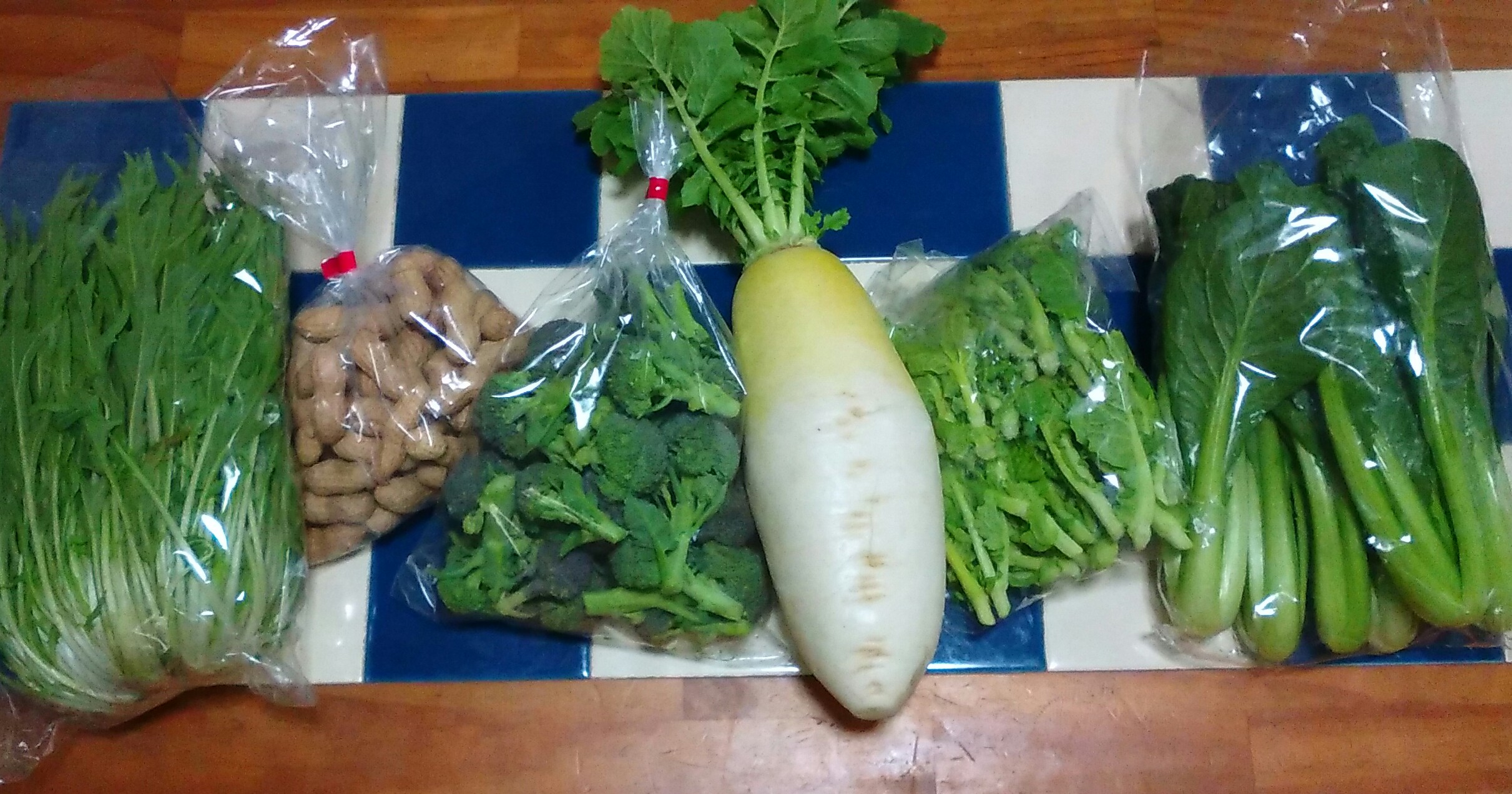 左から水菜、ピーナッツ、ブロッコリー、大根、菜の花、小松菜。