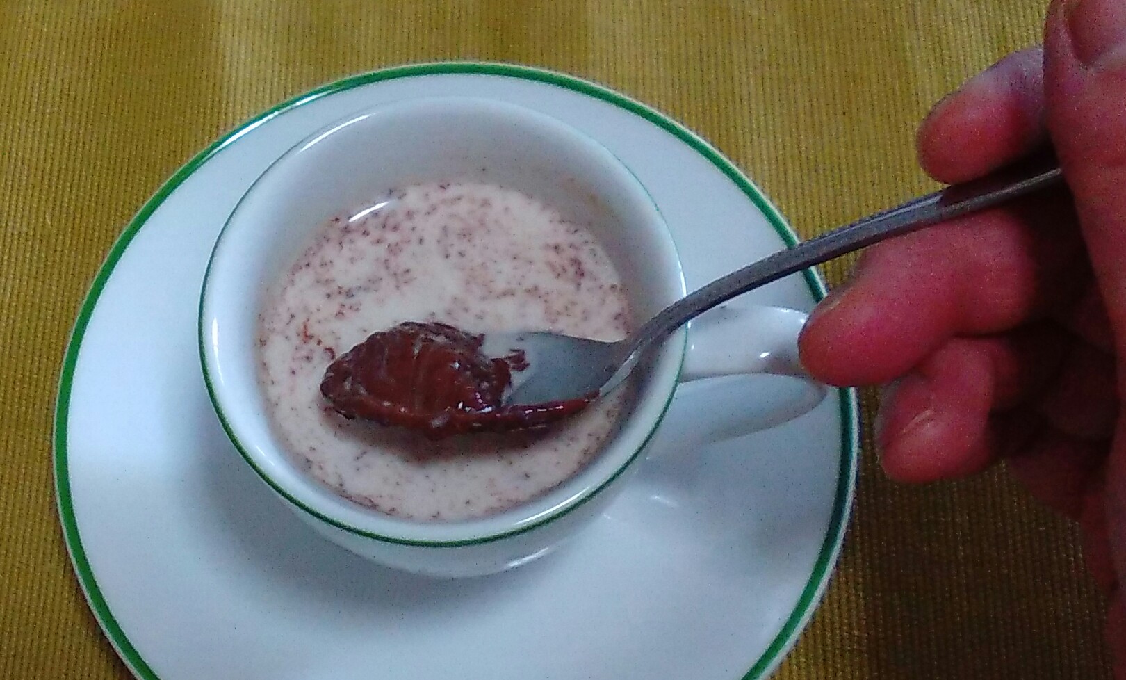 半分溶けたチョコレートをすくいながらココア味の牛乳を飲む♪
