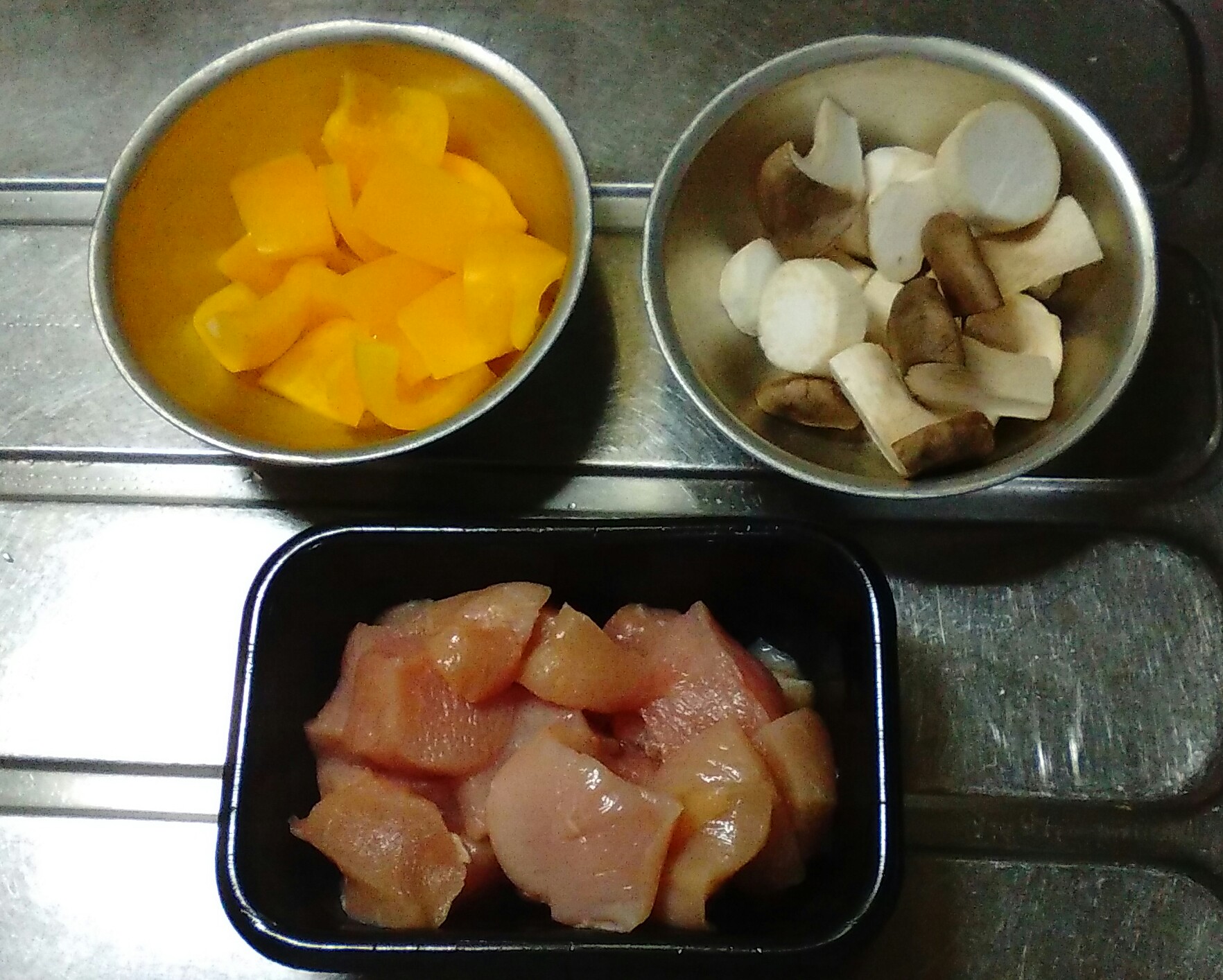 ①エリンギ、パプリカ、鶏肉は一口大に切る。