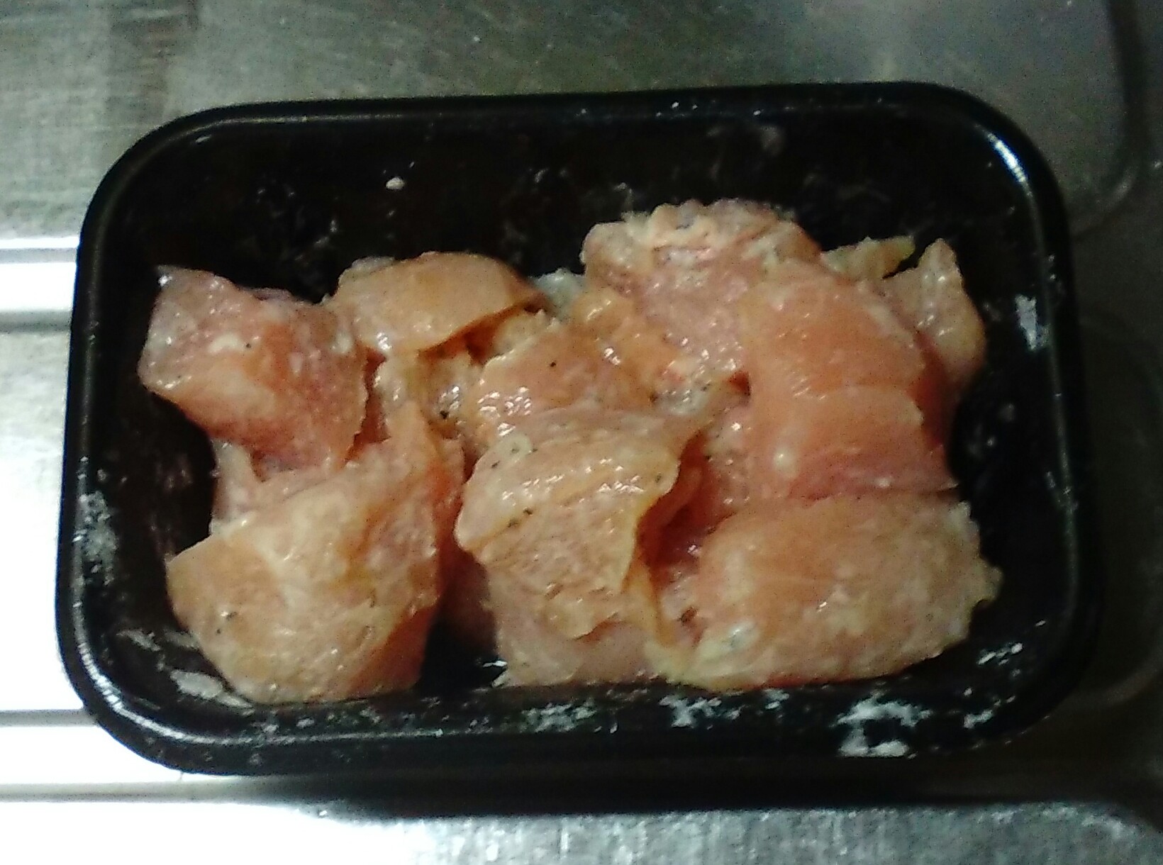 鶏むね肉は、酒と塩胡椒をして揉み、卵白を入れてさらに揉む。