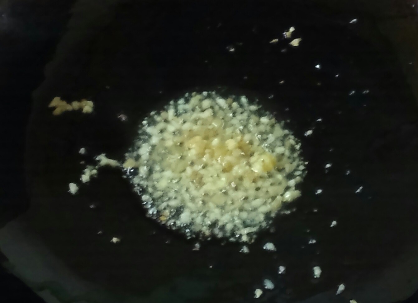 ②フライパンに油を敷き、ニンニクと生姜のみじん切りを入れ点火する。
