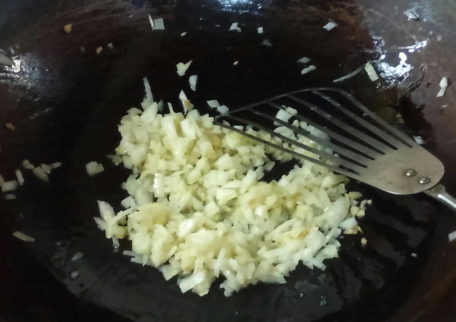 ②香りが出たら玉ねぎのみじん切りを入れさらに炒める。