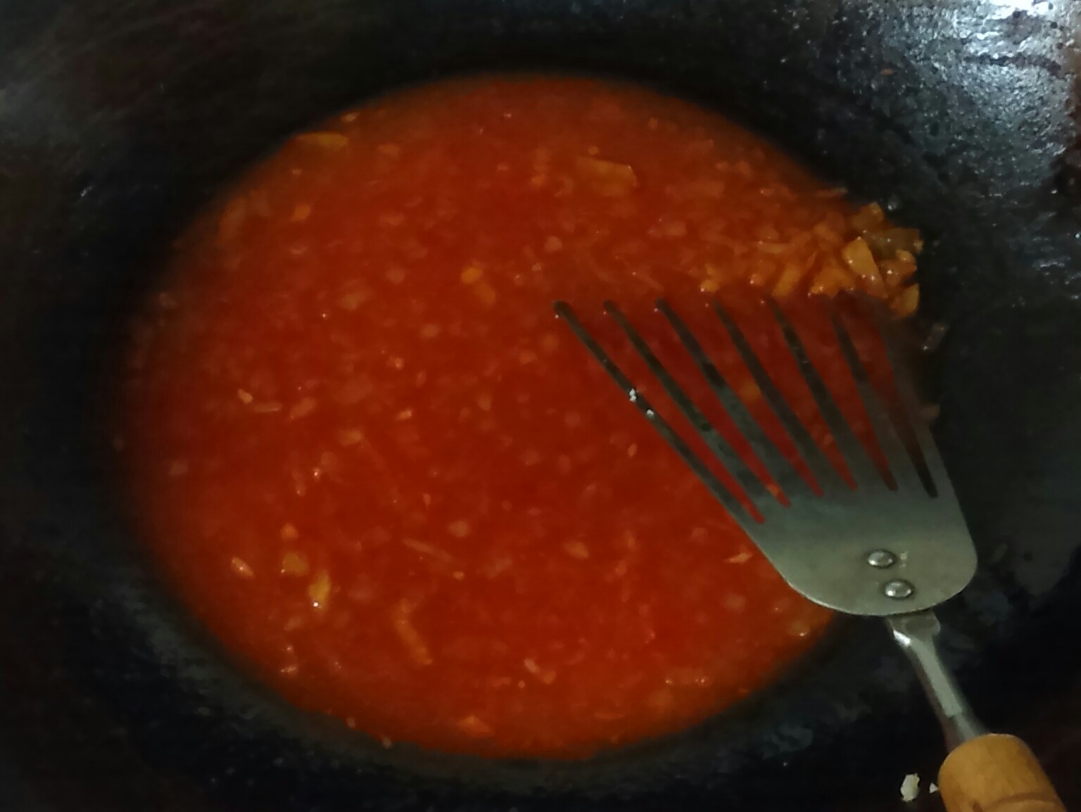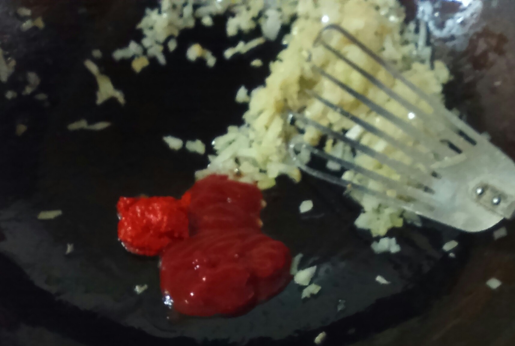 ③炒まれば豆板醤を鍋はだに入れて炒め、ケチャップも同様に炒めてから全体に混ぜる。