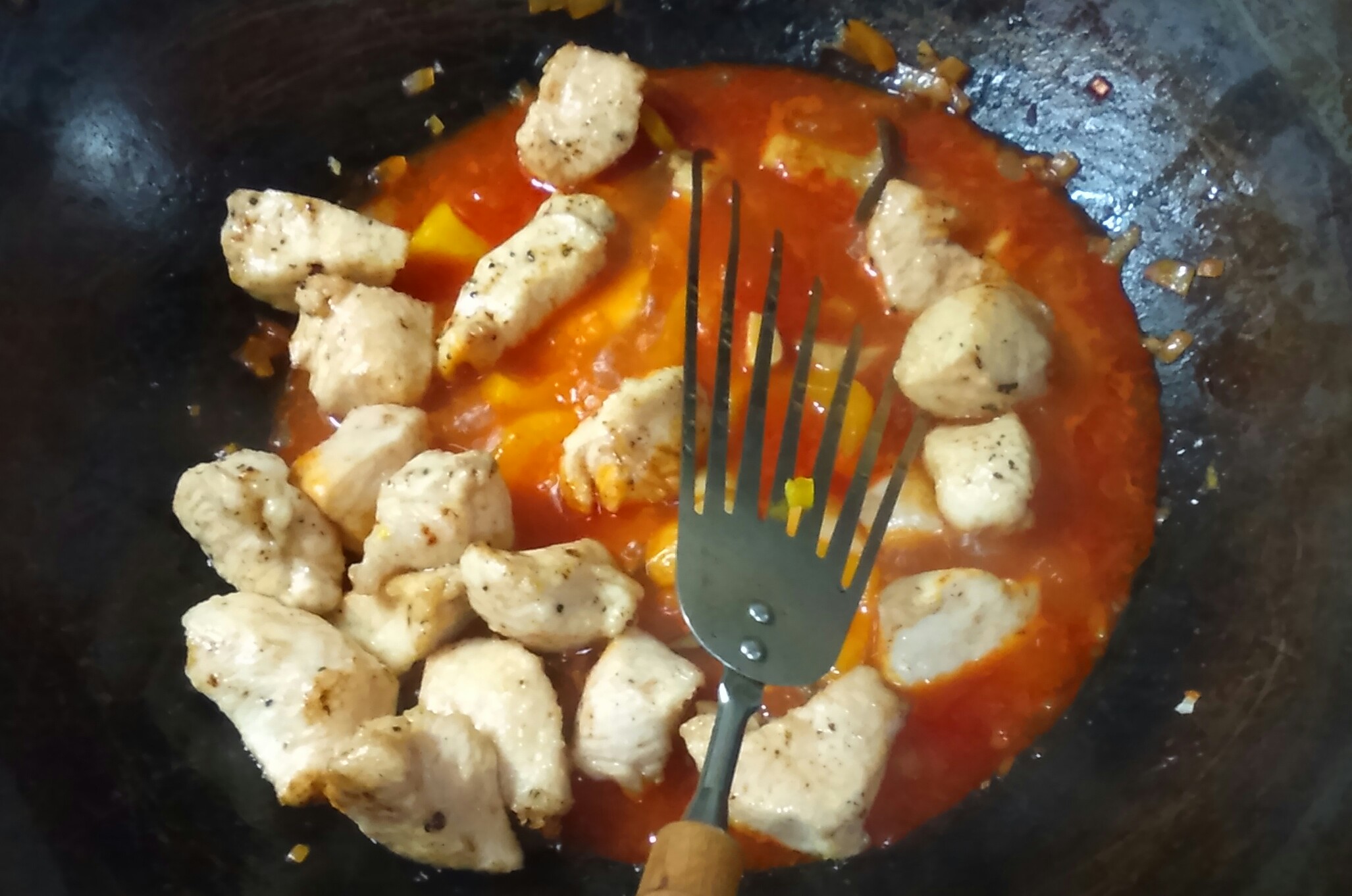 ⑦チリソースに揚げたエリンギとパプリカと鶏むね肉を入れて絡め、最後にごま油と酢を加えれば完成です。