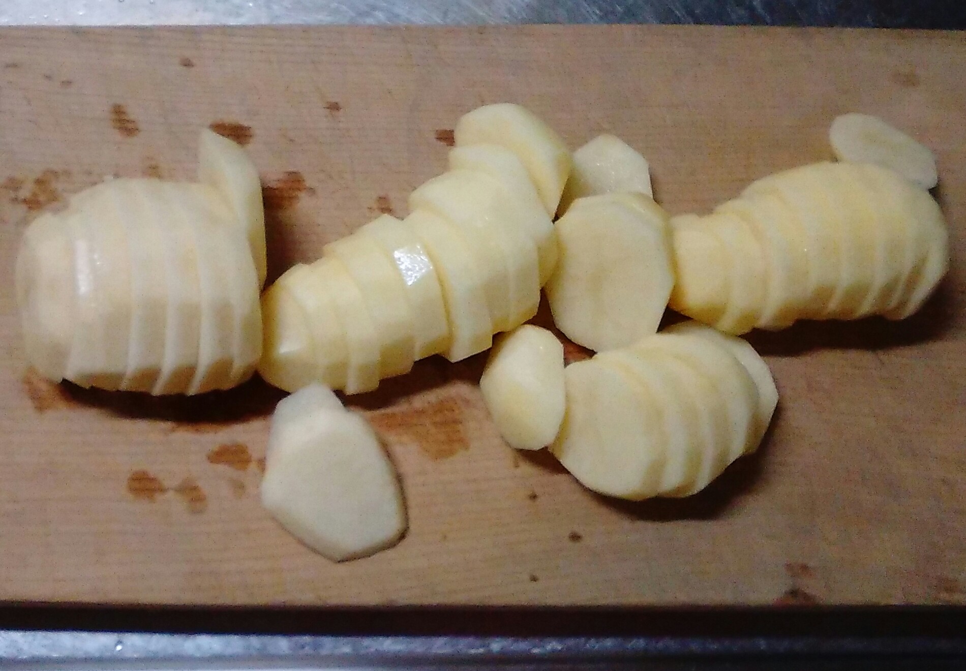 ①じゃがいもは皮をむき、5㎜ほどにスライスする。水にはさらさないでください。