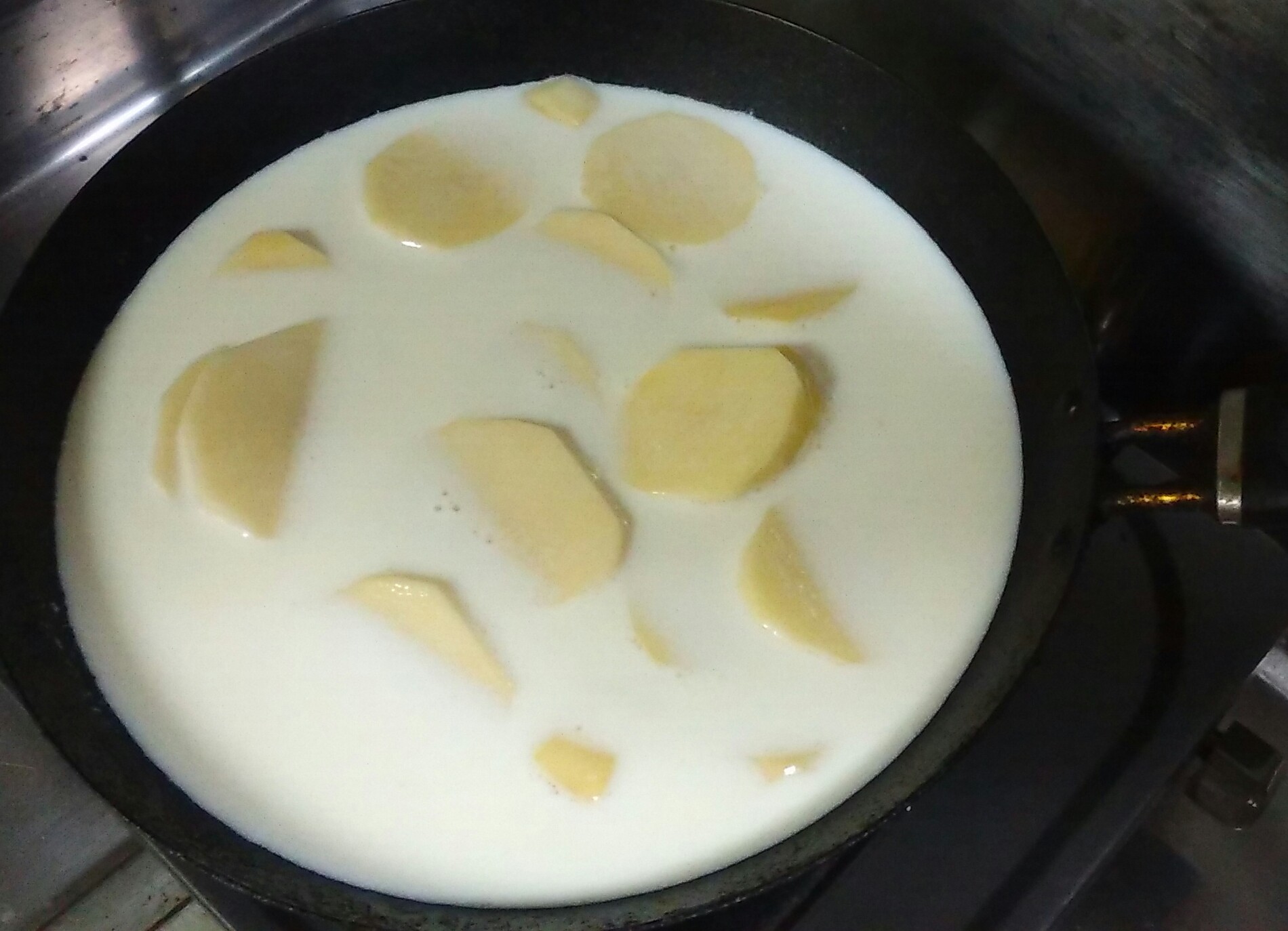 ④じゃがいもの角がとれ、煮くずれる寸前になり、牛乳に少しだけ濃度がつけば、塩コショウ。