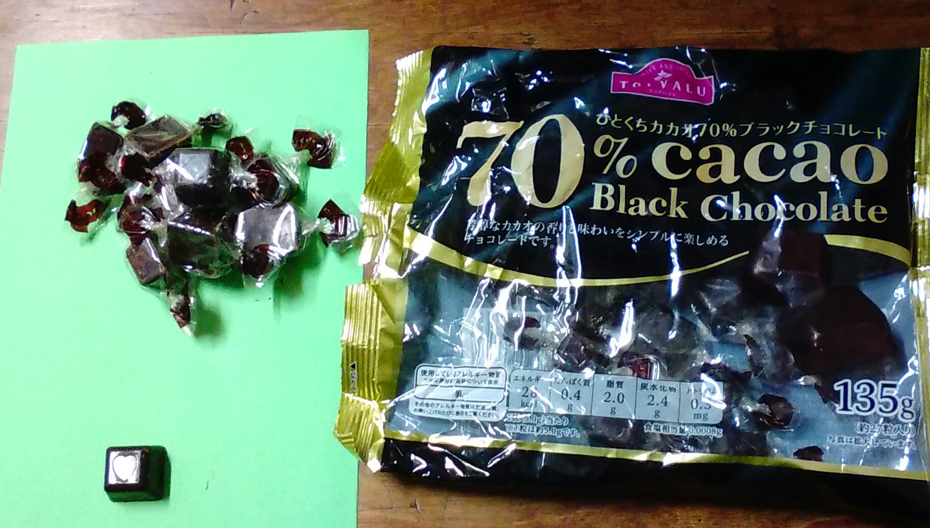 このサイズのカカオ70%のチョコレートなら、1日に5個を目安に食べると良いそうです。