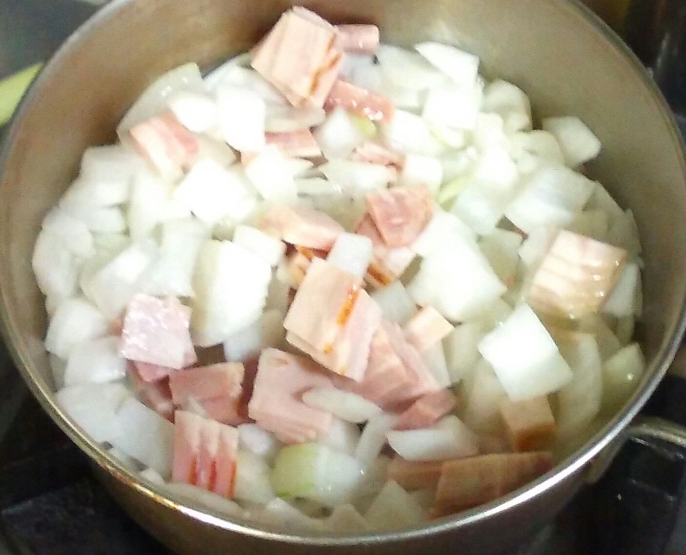 ①鍋にバターを入れて火にかけ、バターが溶けたらサイコロに切った新玉ねぎとベーコンを入れて軽く炒める。