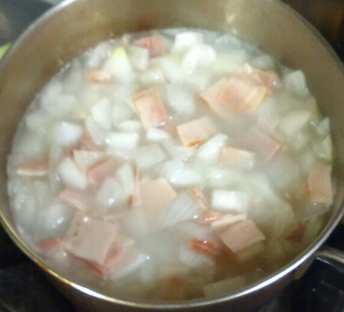 市販の固形や顆粒のブイヨンを入れたくなりますが、味が濁るから入れないほうが良い、家庭ではベーコンの旨味でいいよ、と言われそうしています。