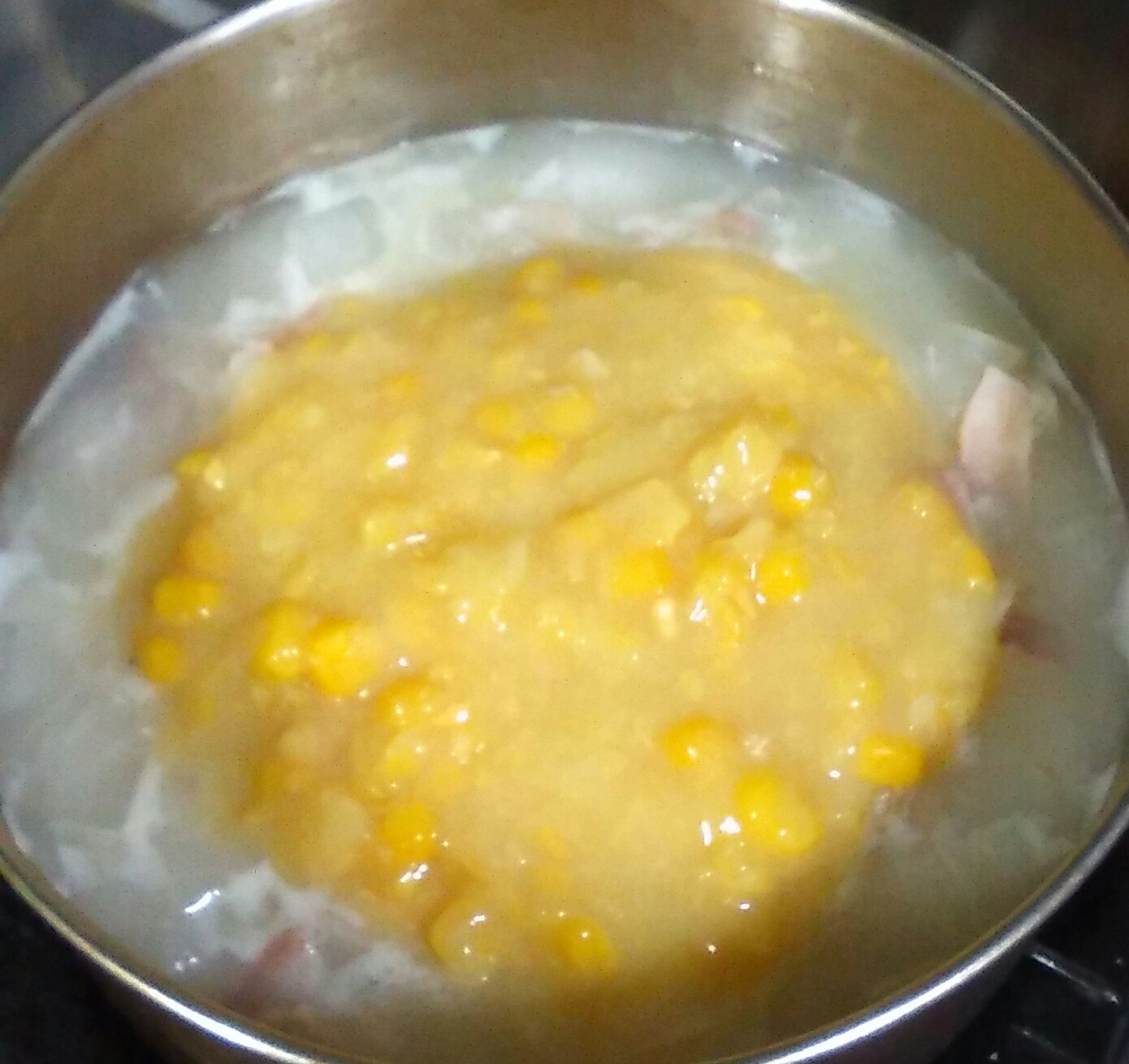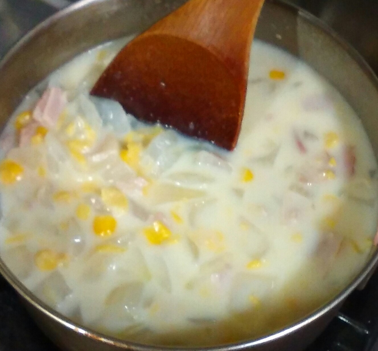 ③玉ねぎが煮えたらクリームコーンと牛乳を入れ、塩胡椒で味を整える。