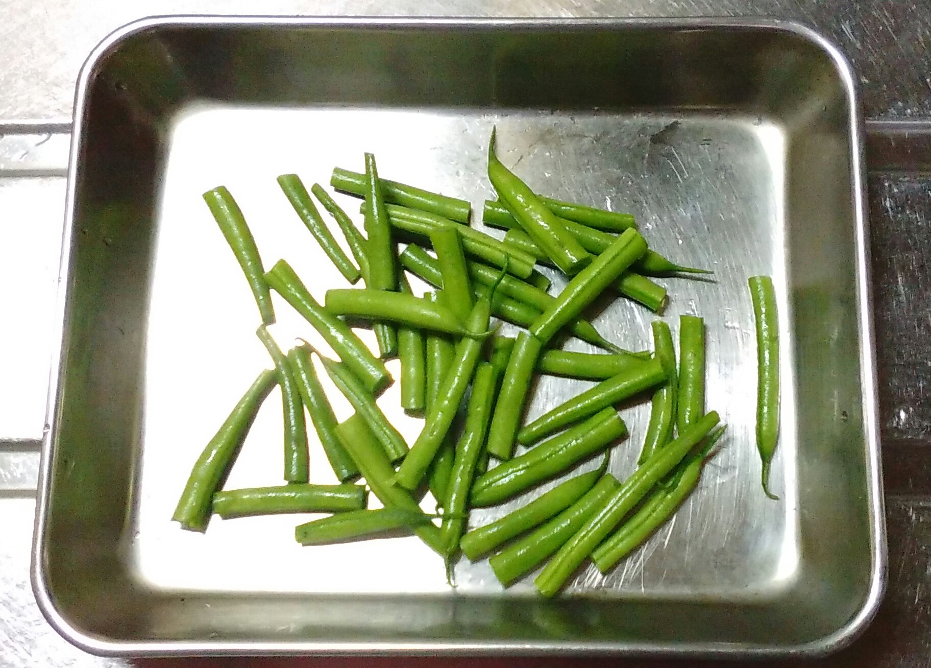 インゲンはヘタを切り4㎝ほどに切る。