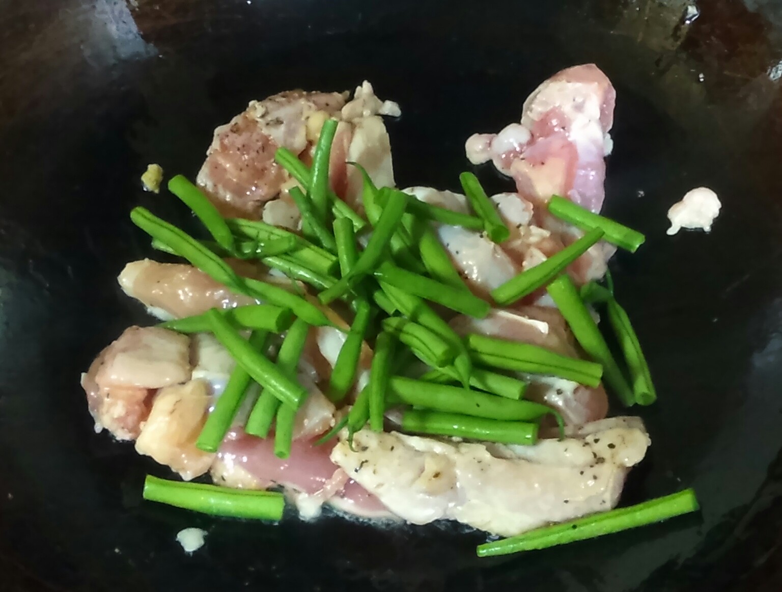 表面の色が変わればしょうがとにんにくを入れ、さらにインゲンを入れ、1~2分炒める。