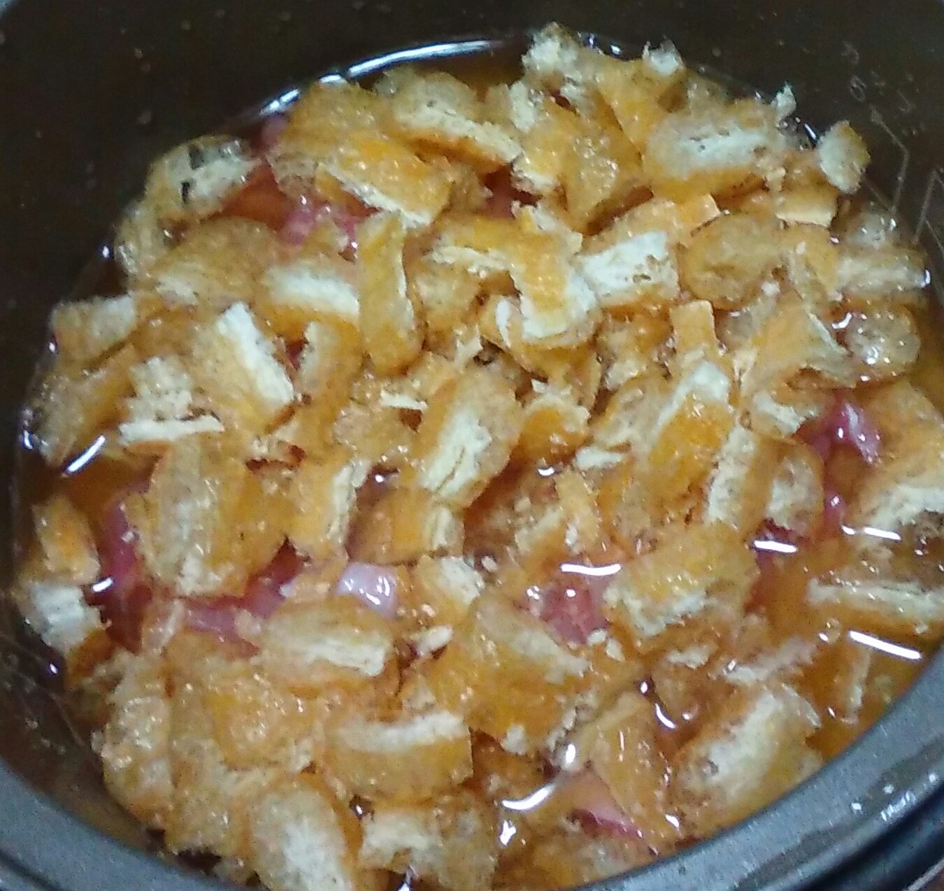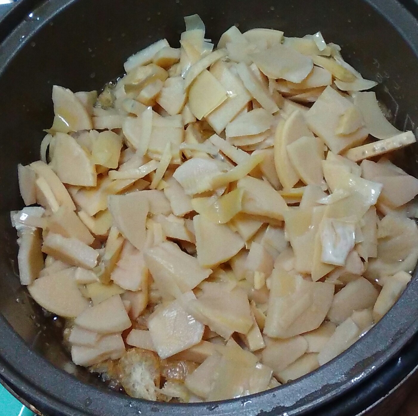 ⑤洗い米を炊飯器に入れ、普通にご飯を炊く分量と同量の出汁を仕掛ける(タケノコの煮汁を先に入れ足りない分を足す)。