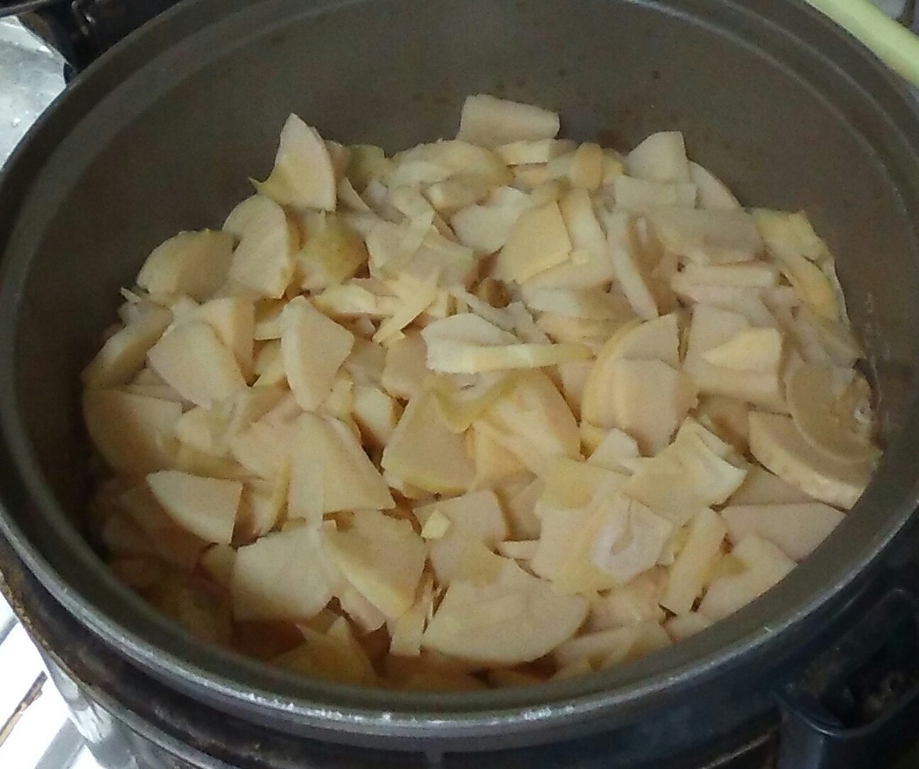 ヌカでゆでるやり方だと、皮のまま茹でないといけないから大きな鍋がいるし、茹でたあとの鍋はヌカがこびりついて洗うのが大変。