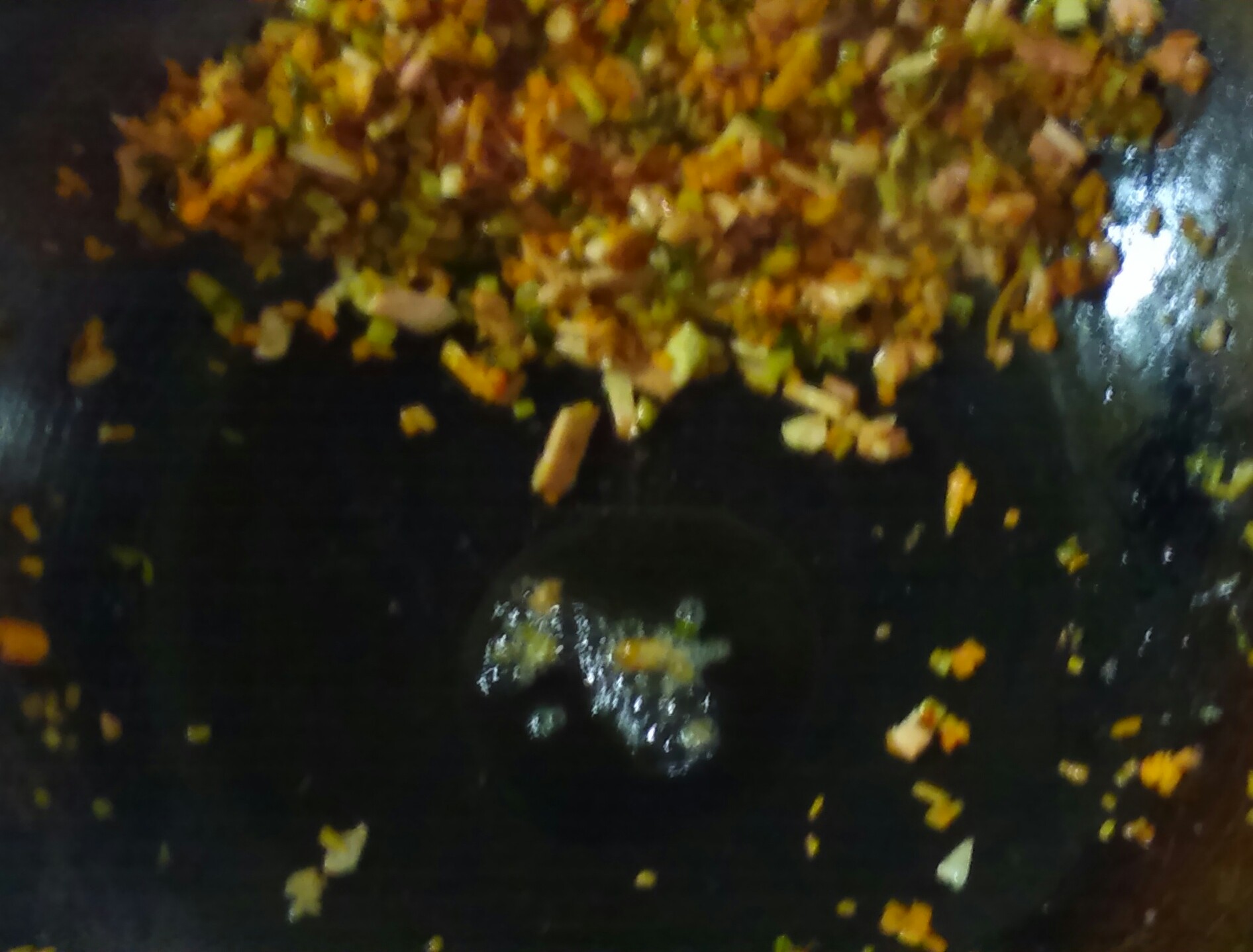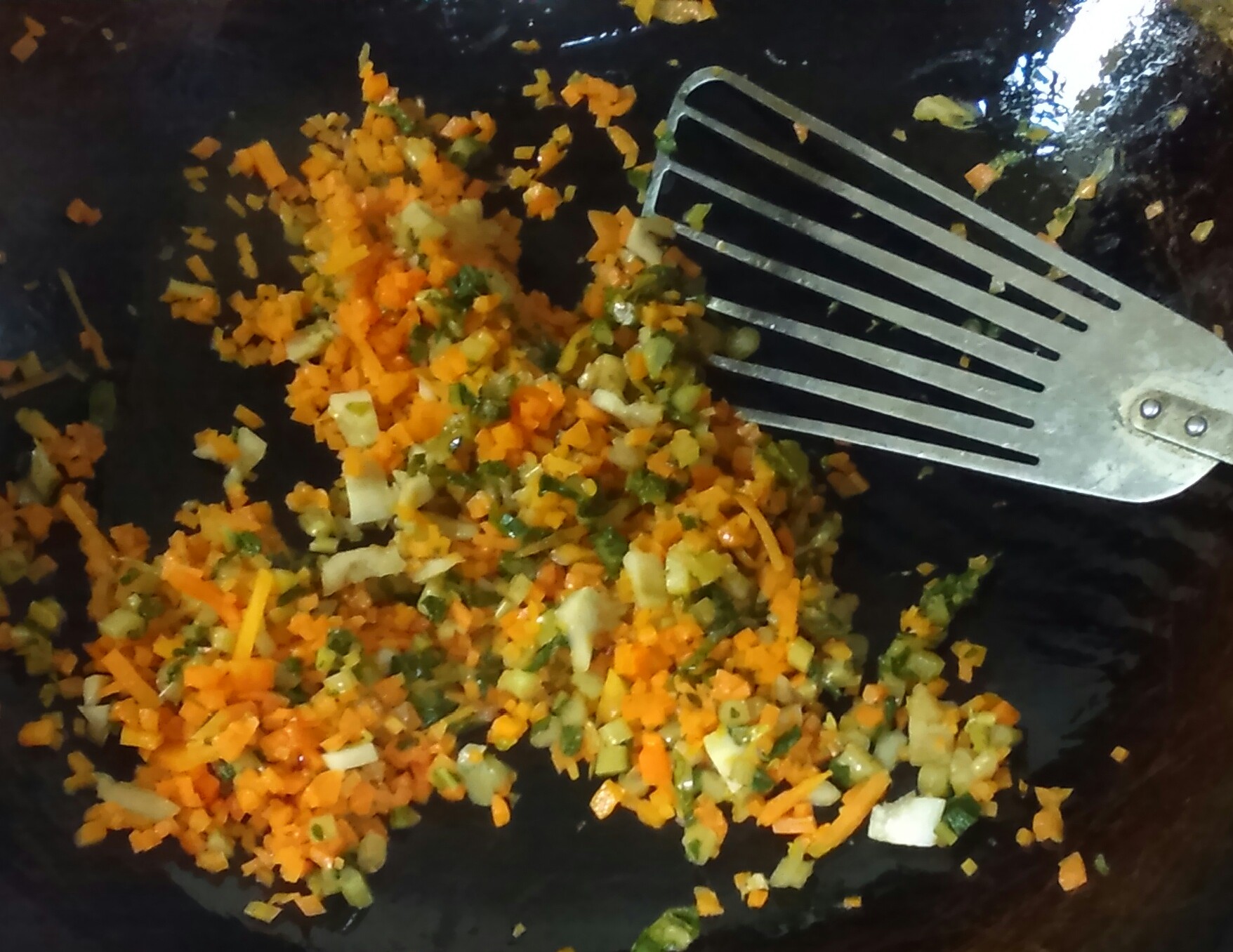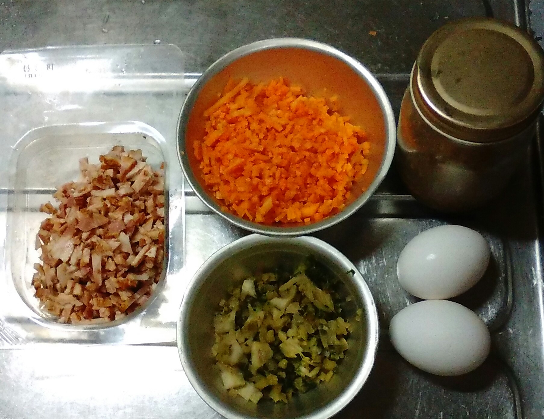 ①大根葉のぬか漬け、ニンジン、焼豚はみじん切りにする。