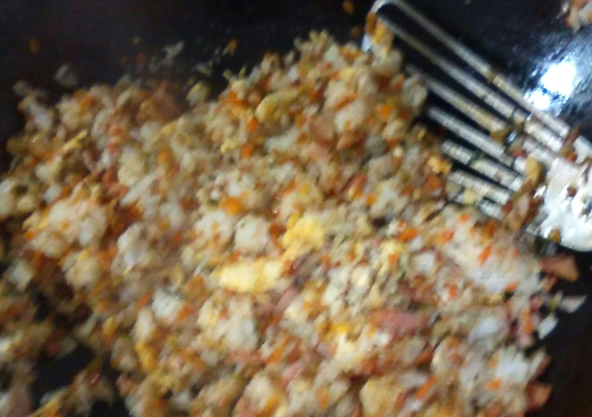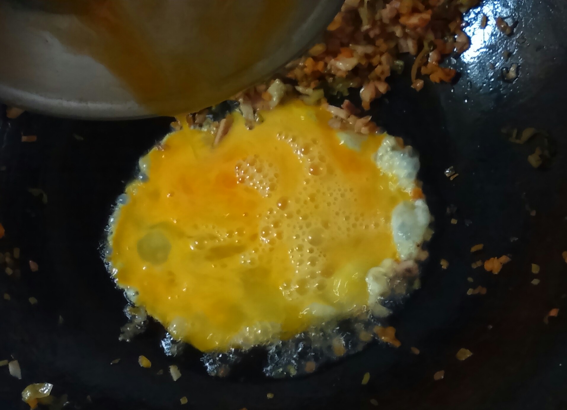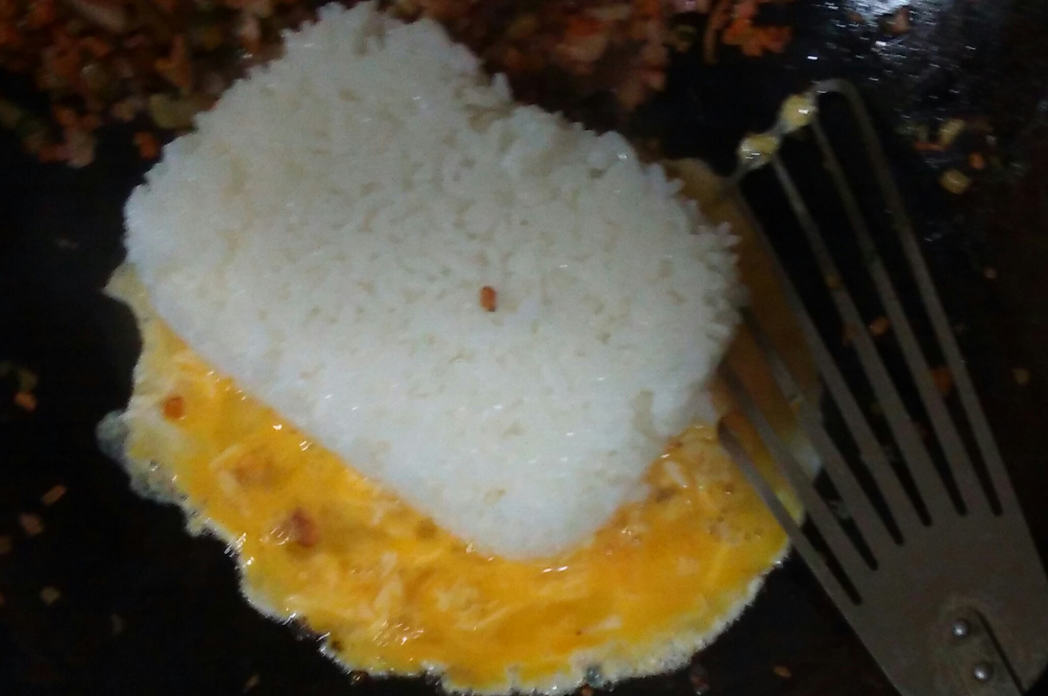 ⑦卵が油を吸ってふんわり膨れてきたら温かいご飯を入れる。