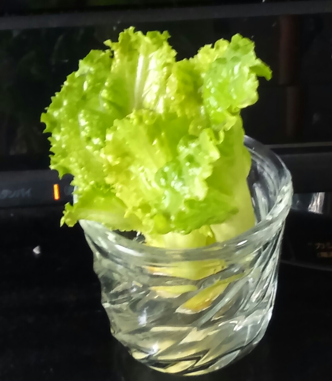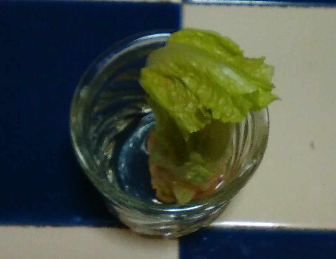 サニーレタスの芯に近い部分の小さい葉を残して浸けてみると…。