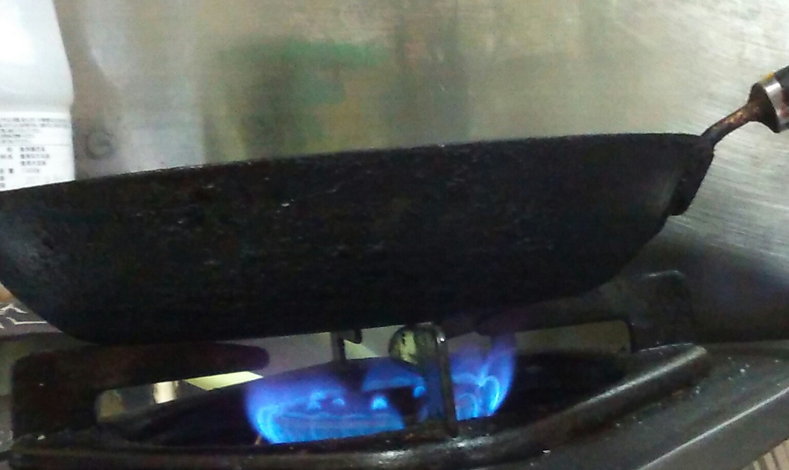 ③横から見て、フライパンに炎の先が当たるか当たらないか程度の中弱火で加熱する(フタはしない)。