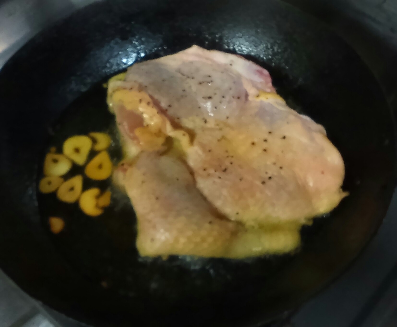 ②フライパンに火をつけずオリーブ油を入れ、皮を上にした鶏肉とニンニクを入れてから点火する。