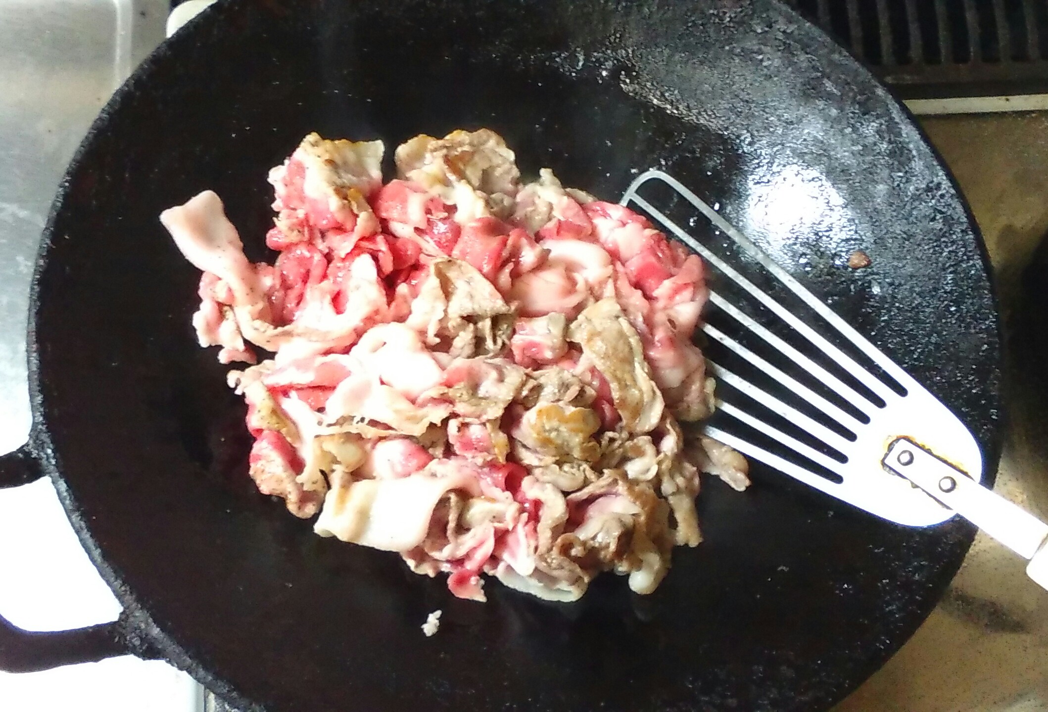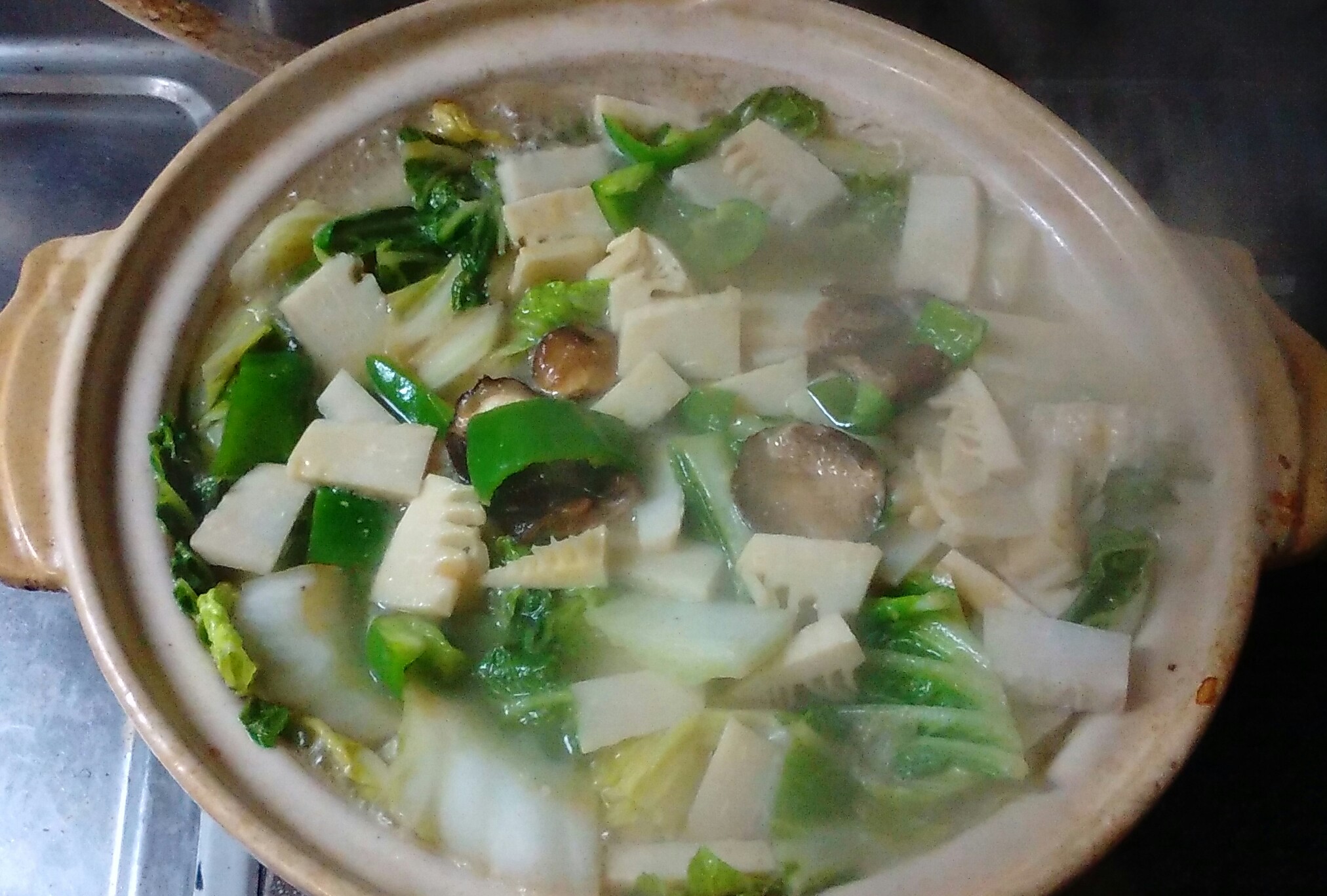 ③同じ鍋で、白菜、ピーマン、タケノコ、しいたけを順に炒める。