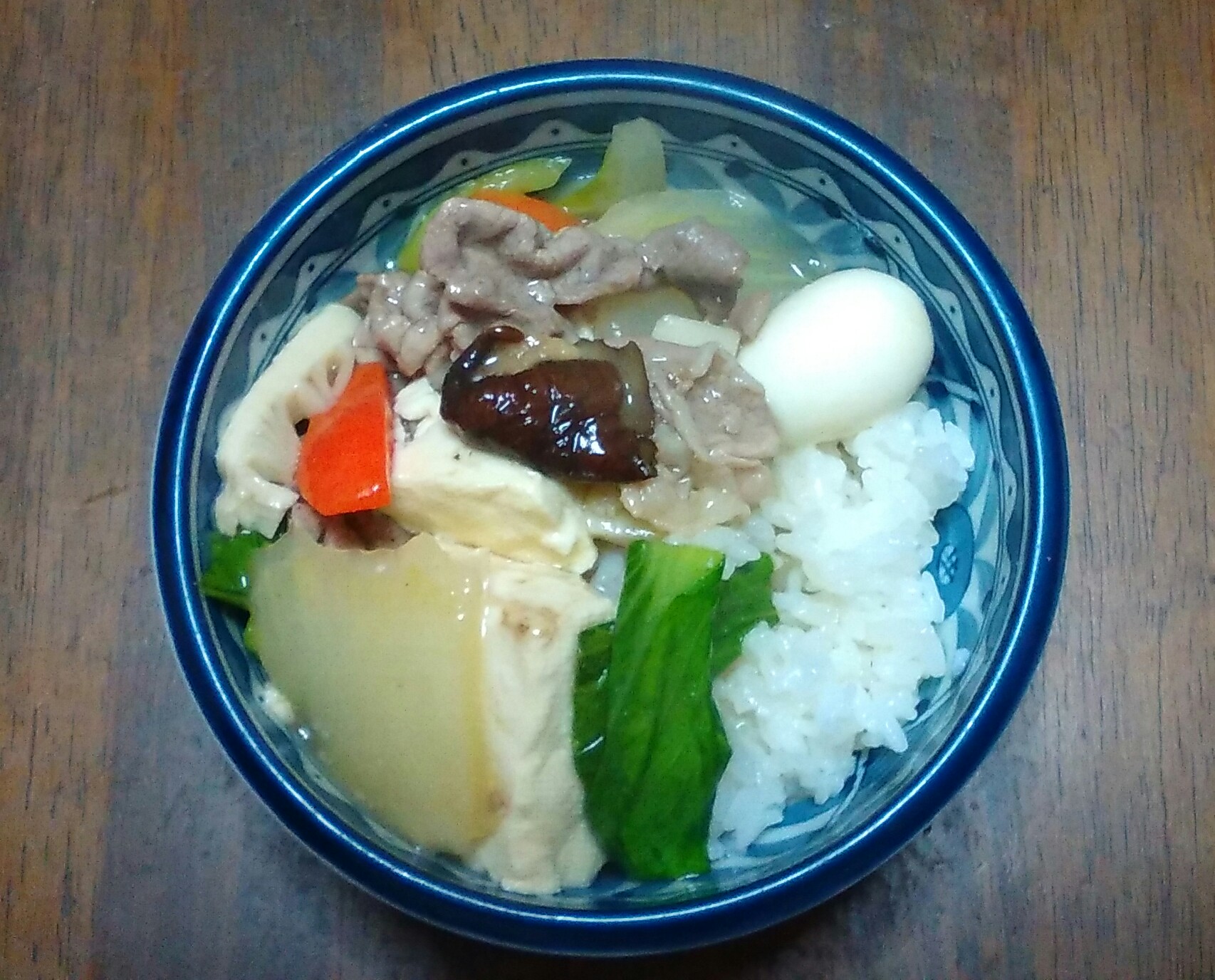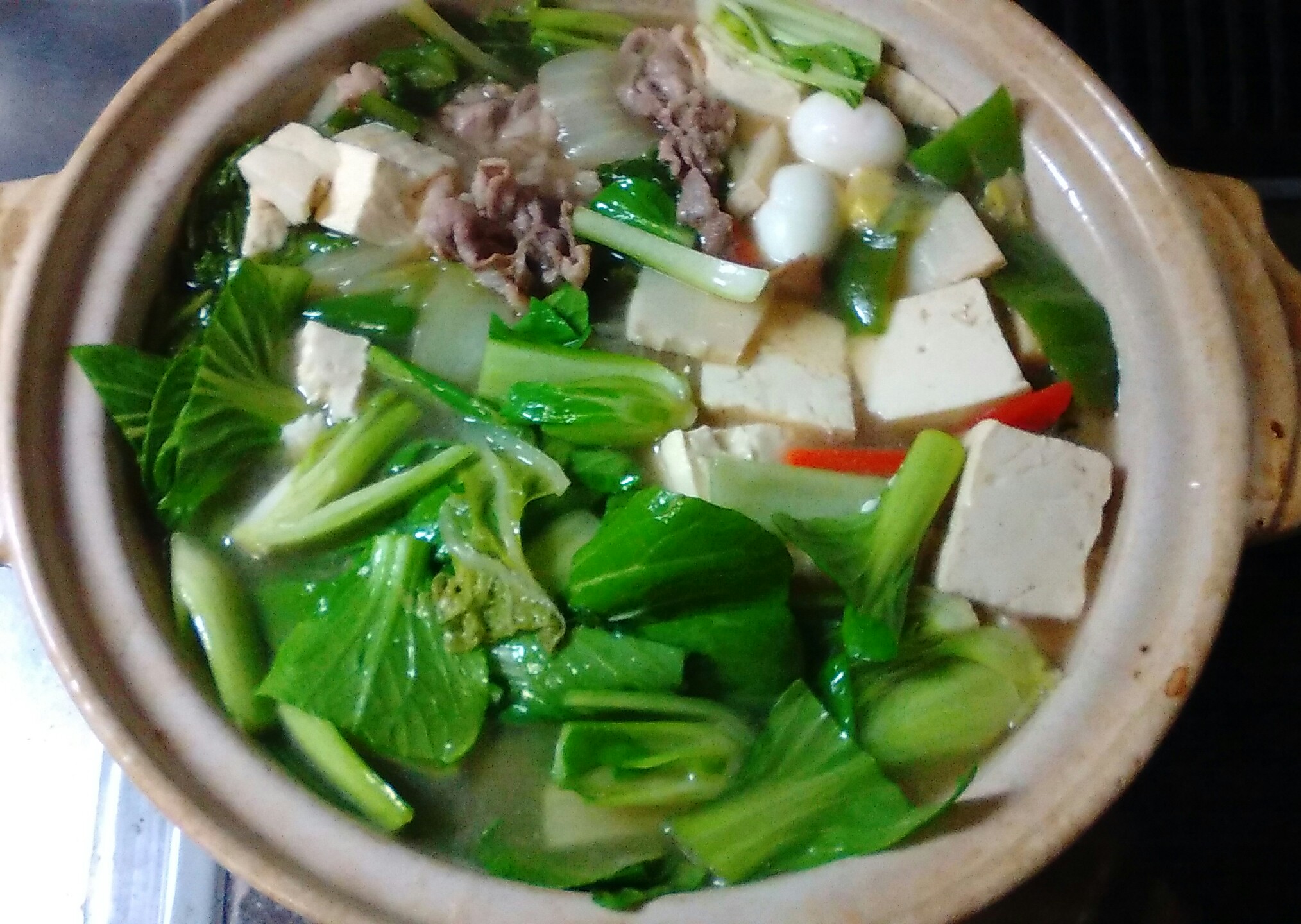⑤煮えればニンジン、うずら卵、一口大に切った木綿豆腐、チンゲン菜を入れる。